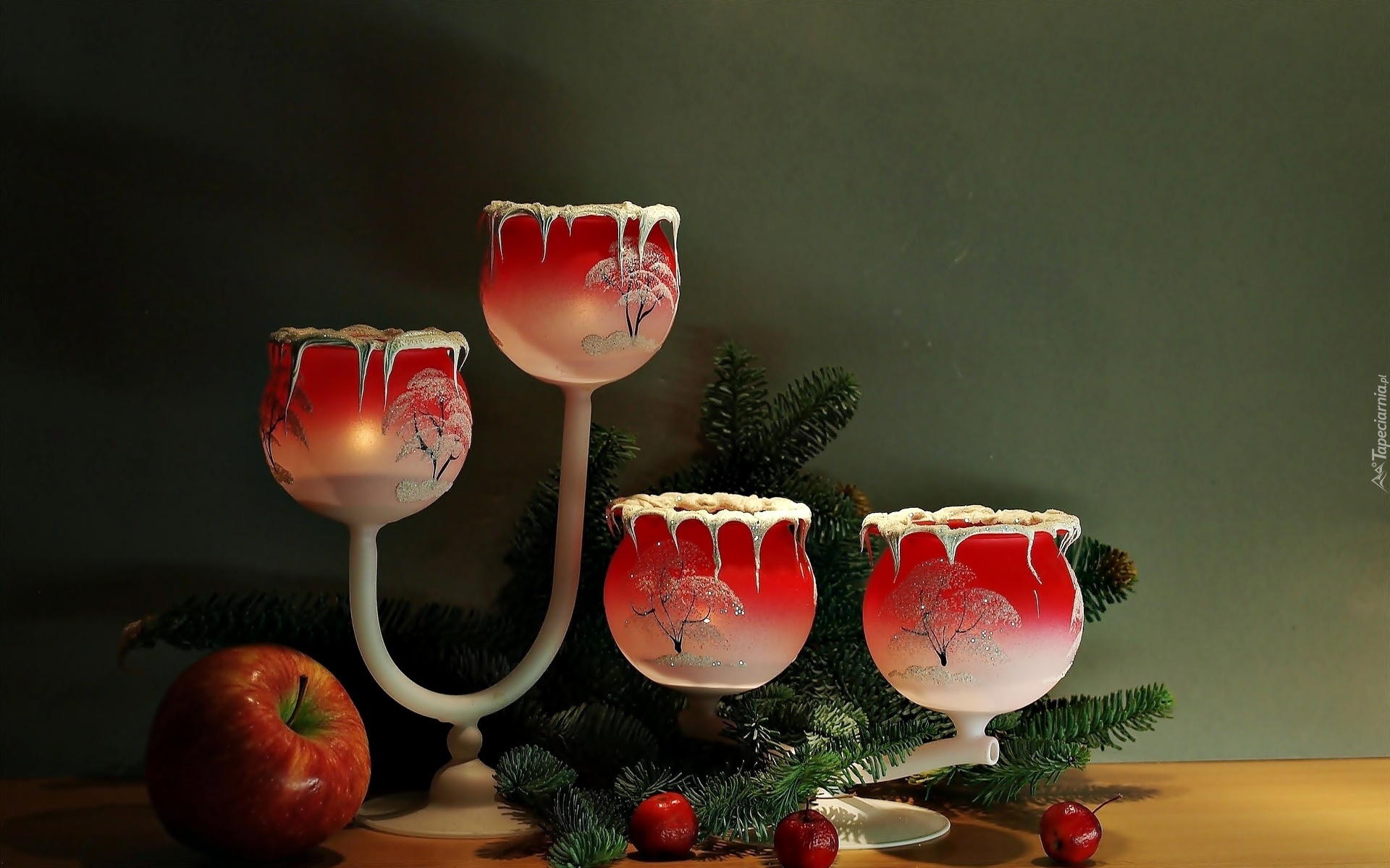 Edytor tapety: Świecznik, Świece, Jabłko, Gałązki, Dekoracja