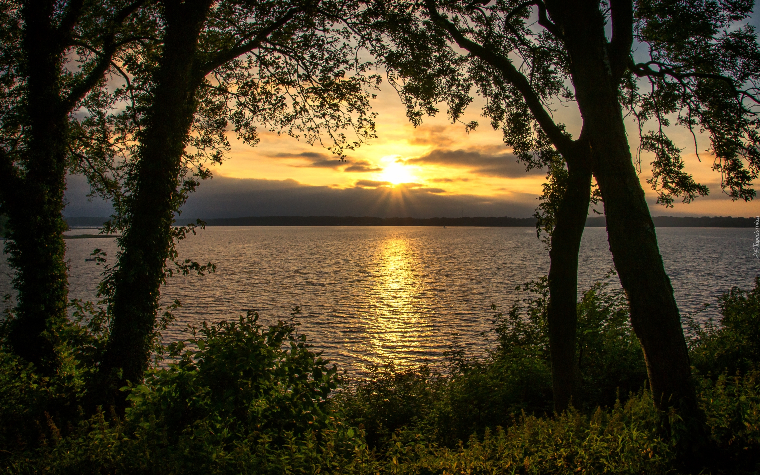Edytor tapety: Jezioro, Drzewa, Zachód Słońca