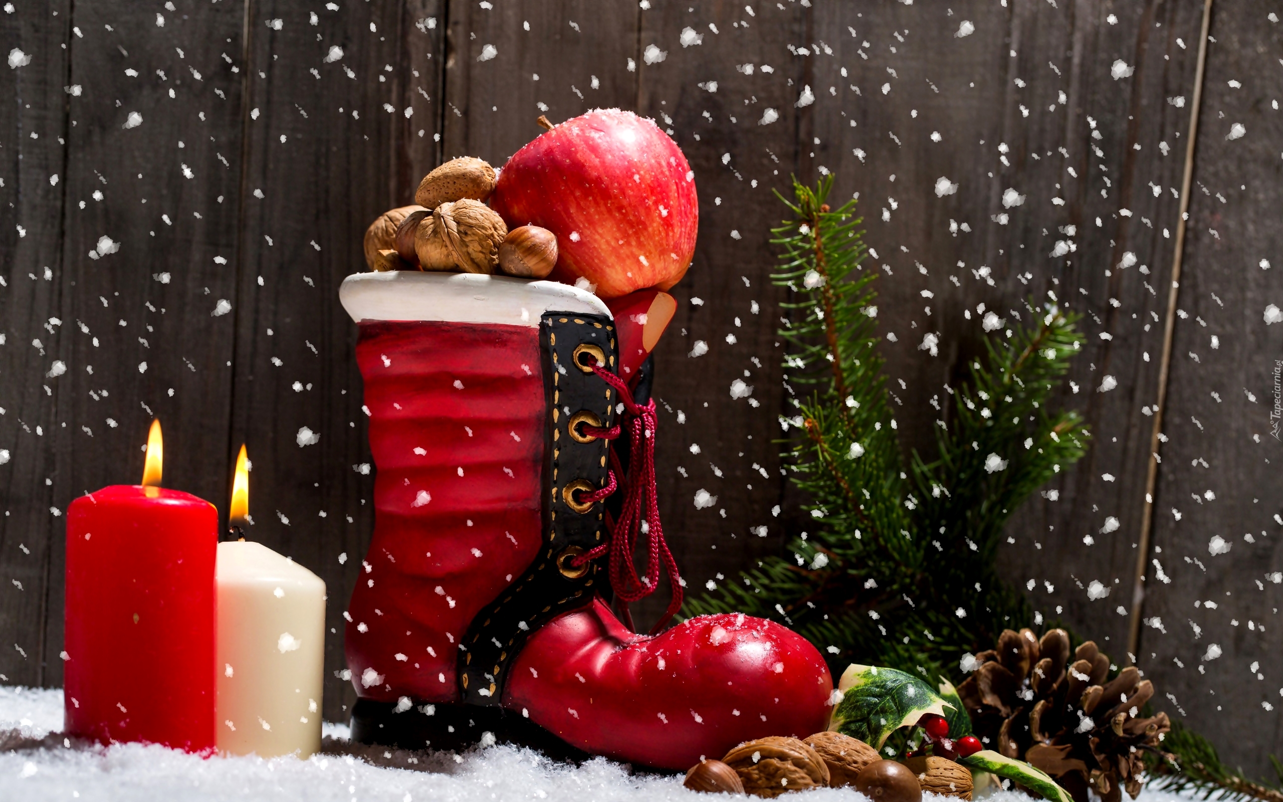 Edytor tapety: Kompozycja, Świąteczna, But, Świece, Szyszki, Jabłko, Orzechy