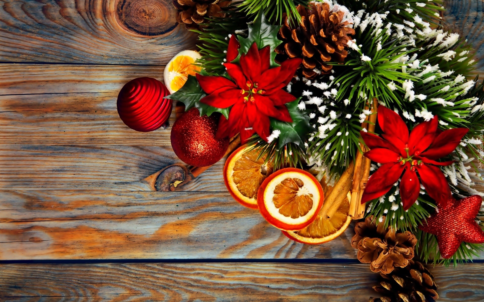 Edytor tapety: Boże Narodzenie, Dekoracja, Gałązki, Szyszki, Pomarańcze