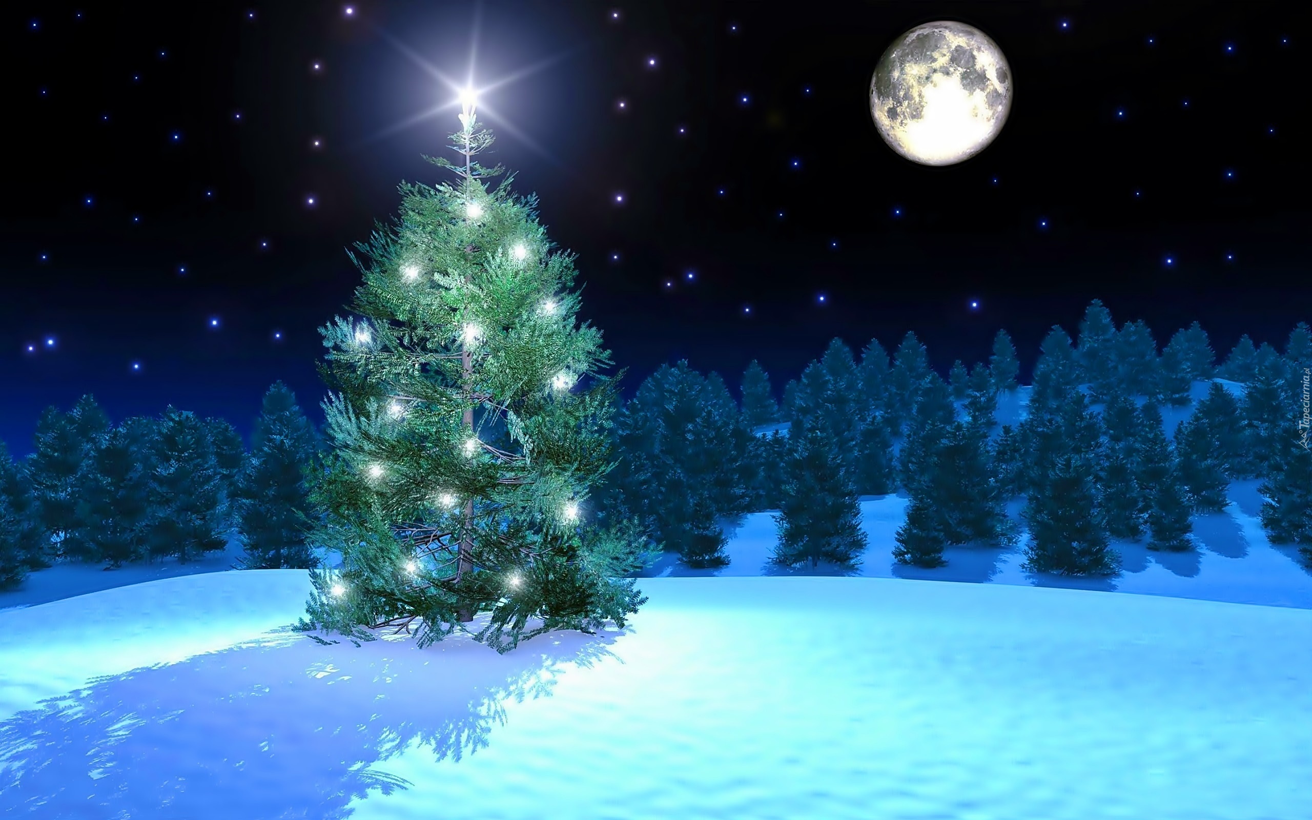 Edytor tapety: Zima, Świerki, Księżyc, Gwiazdy