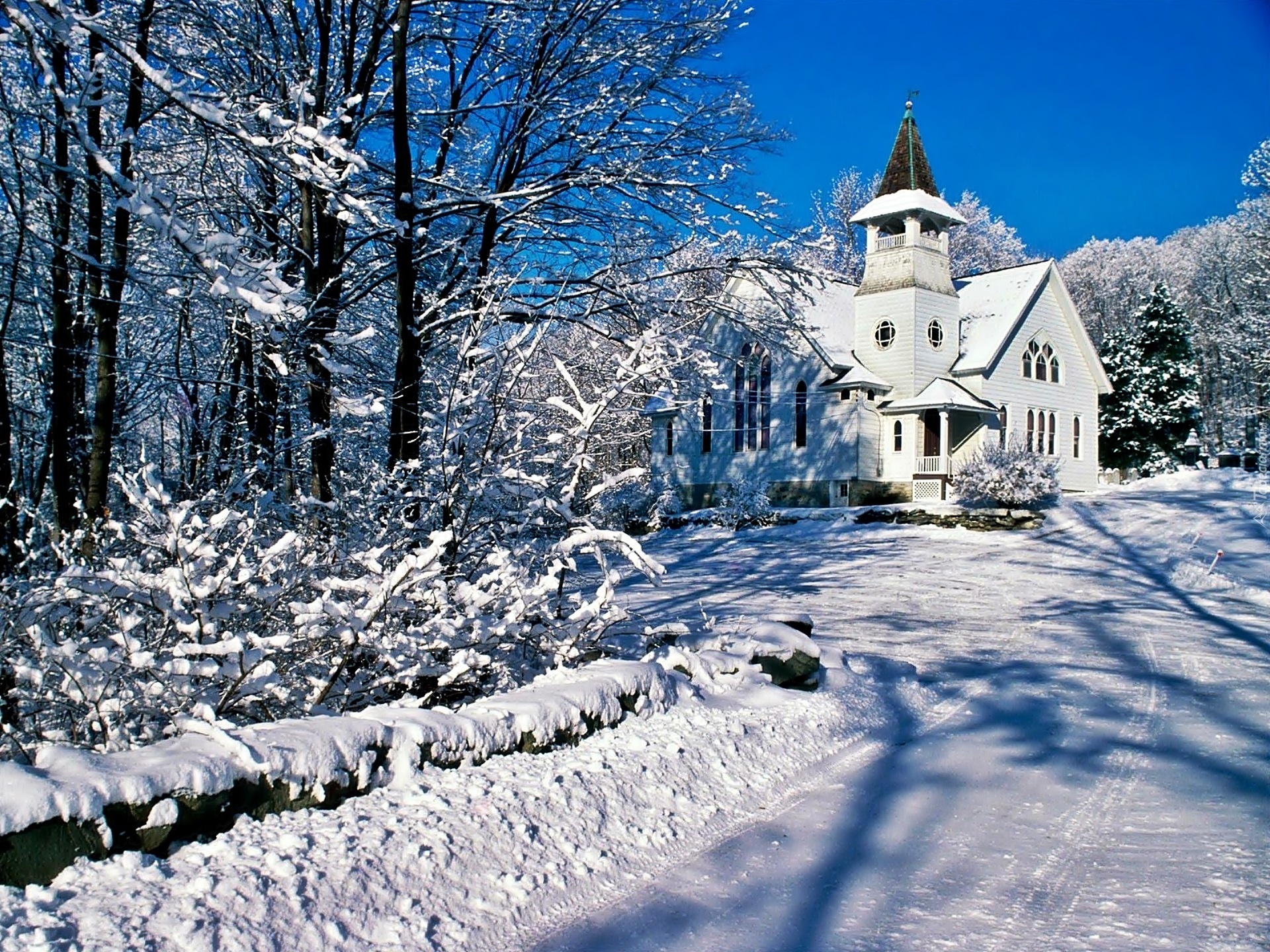 Edytor tapety: Zima, Drzewa, W Śniegu, Droga, Kościół, Światło, Cień