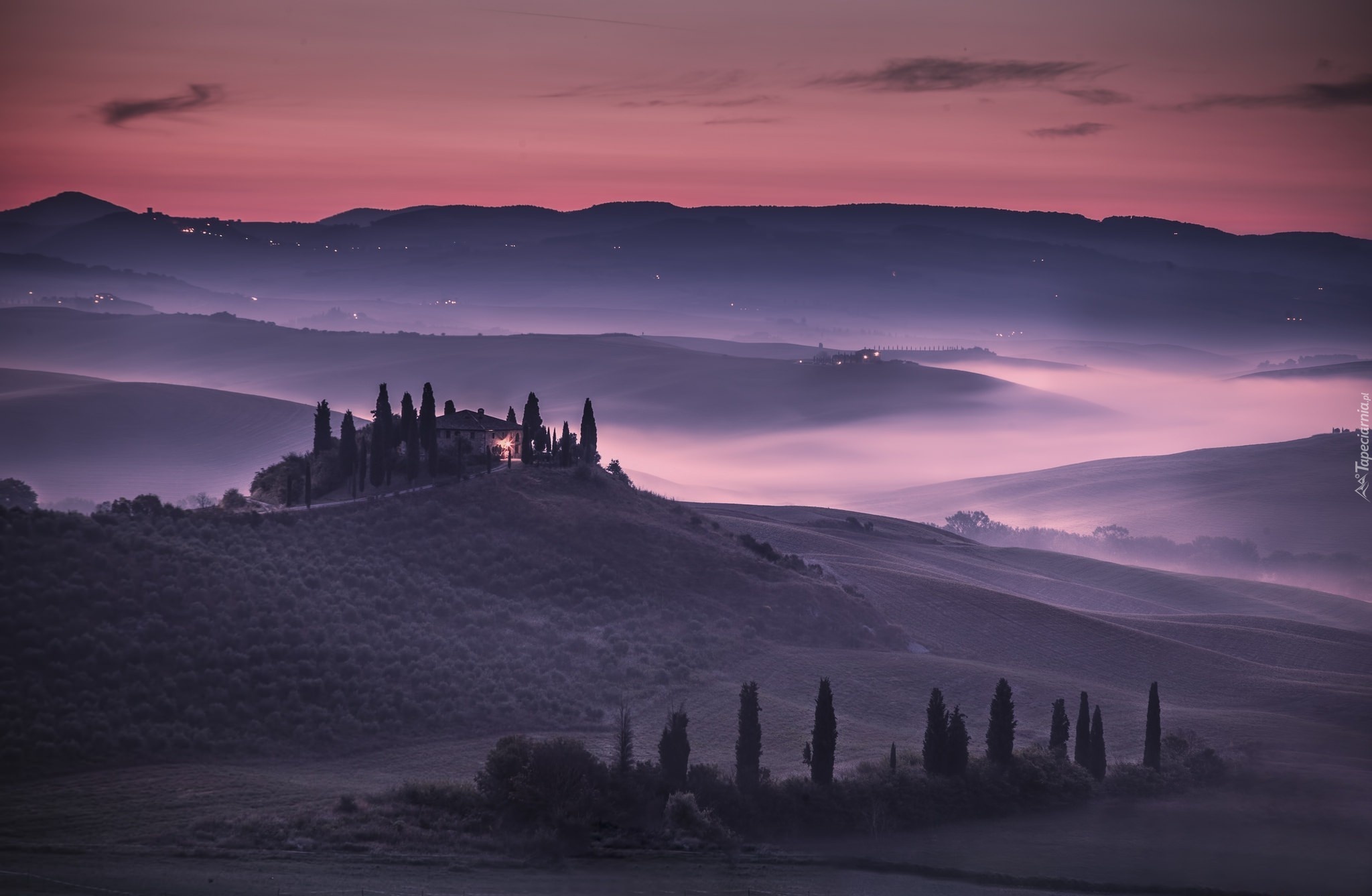 Edytor tapety: Mgła, Drzewa, Wzgórza