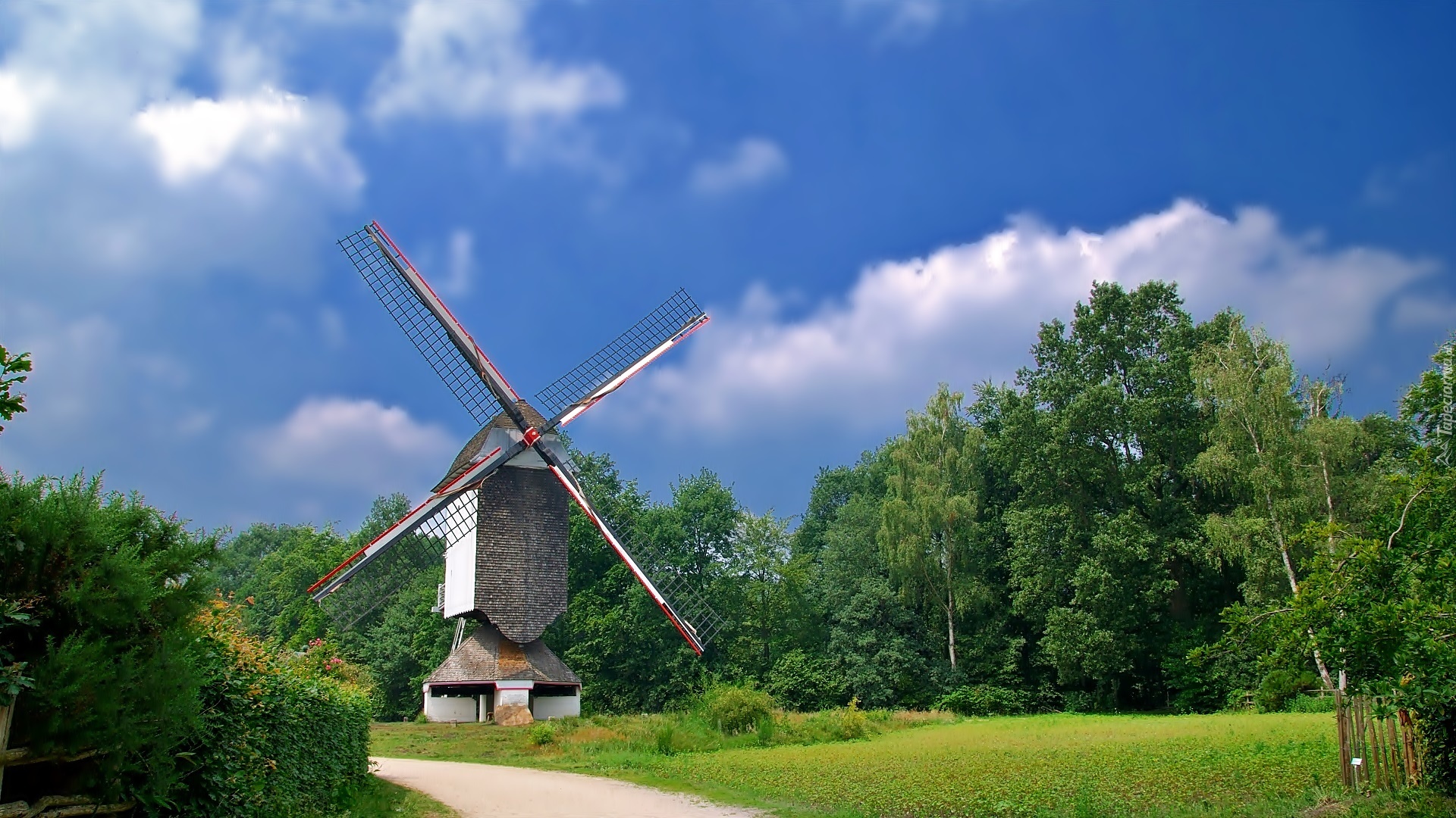 Edytor tapety: Wiatrak, Las, Droga, Obłoki