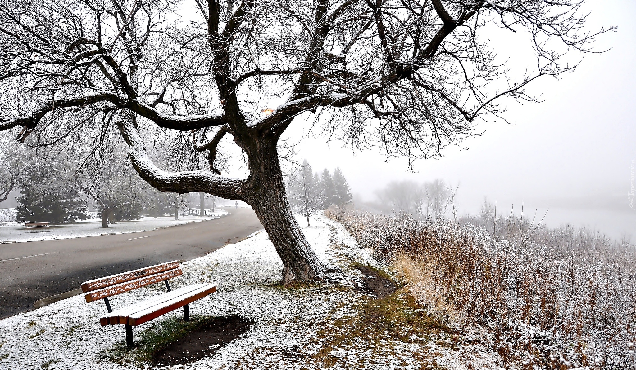Edytor tapety: Zima, Mgła, Droga, Ławka, Drzewo