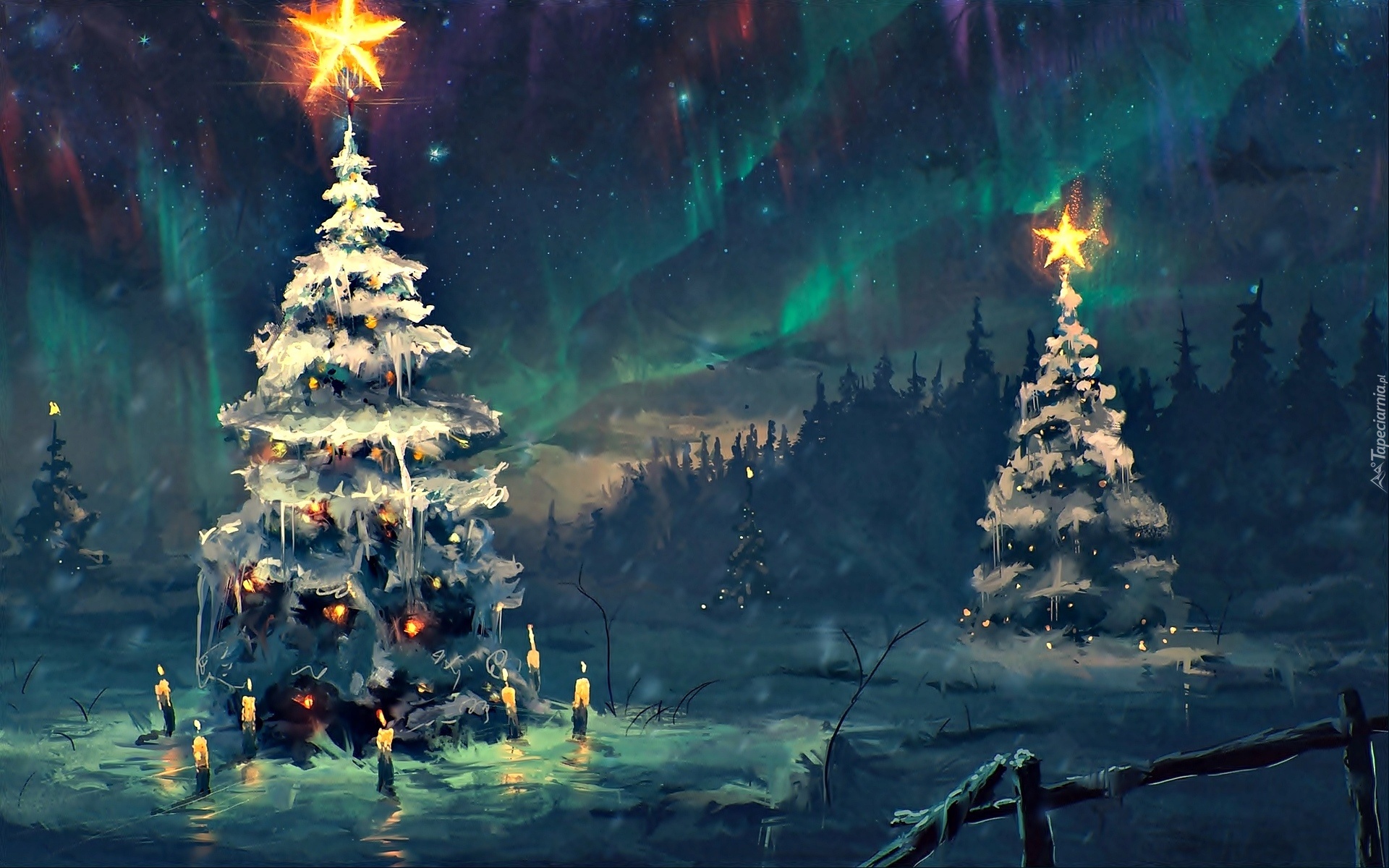 Edytor tapety: Zorza Polarna, Zima, Choinki, Noc, Fantasy