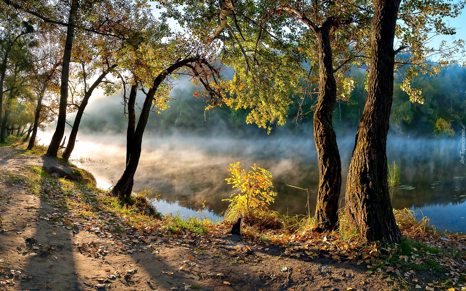 Edytor tapety: Rzeka, Brzeg, Drzewa, Jesień, Mgła