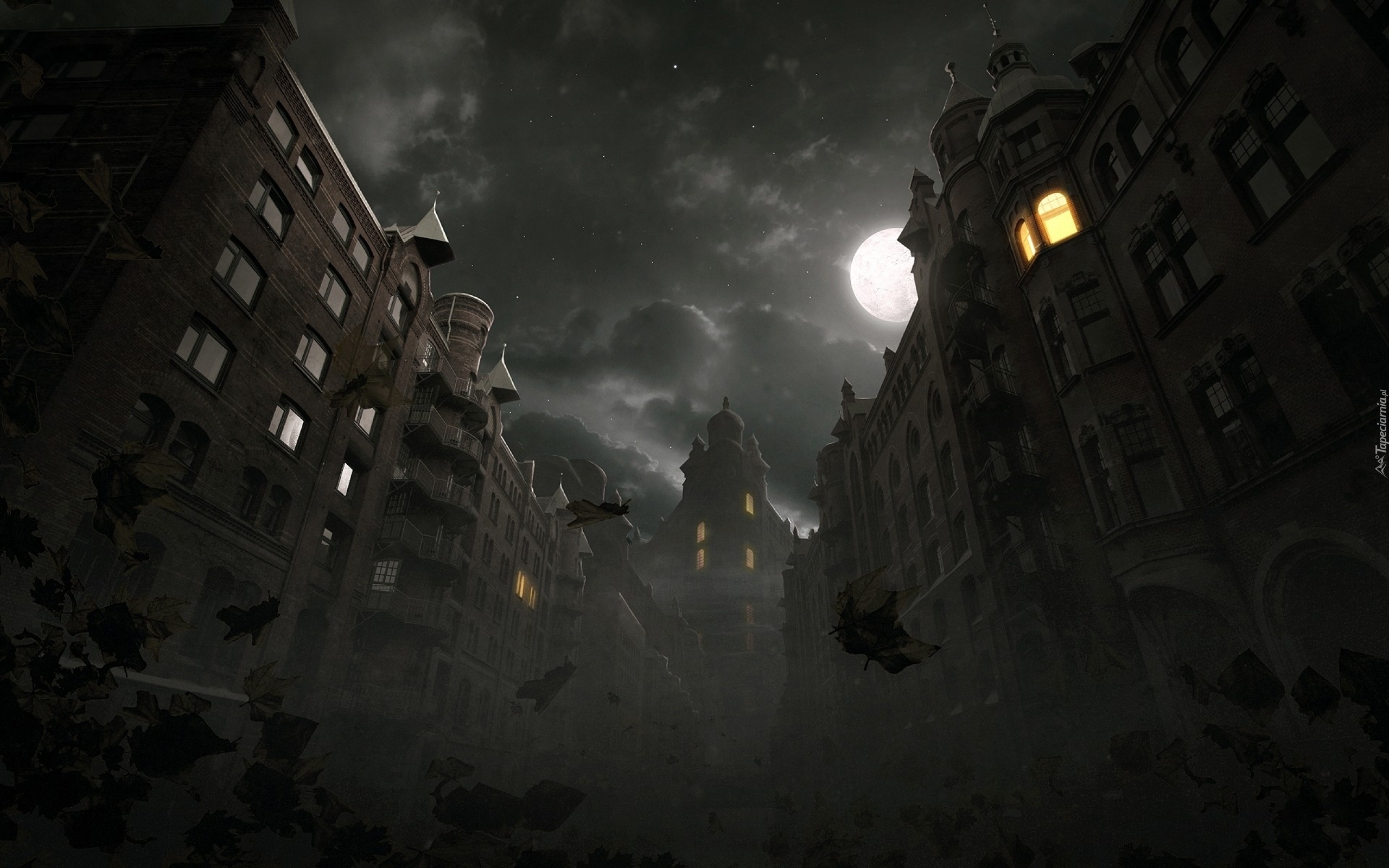 Edytor tapety: Budynki, Księżyc, Liście, Chmury