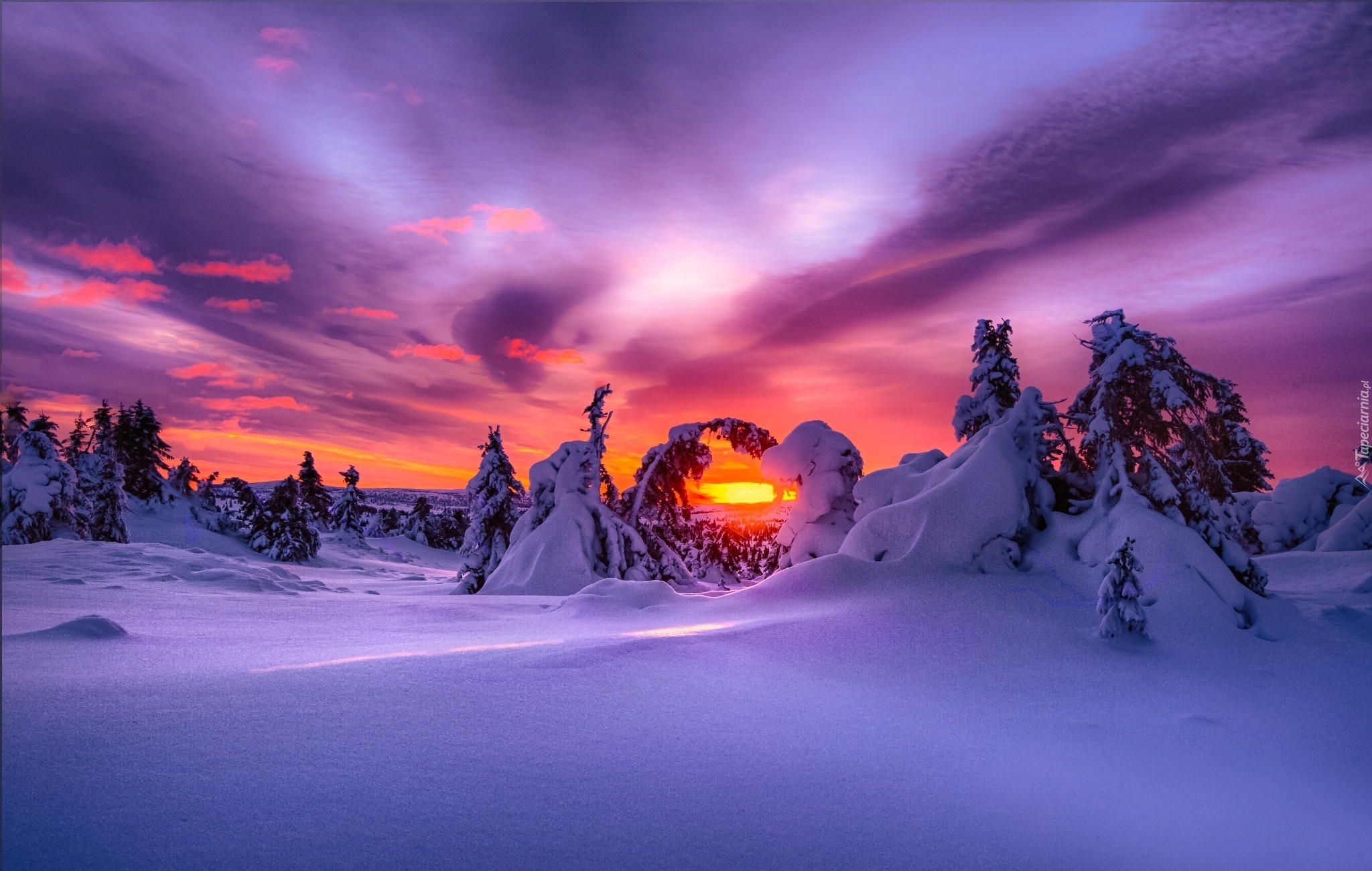 Edytor tapety: Zima, Wschód Słońca, Drzewa