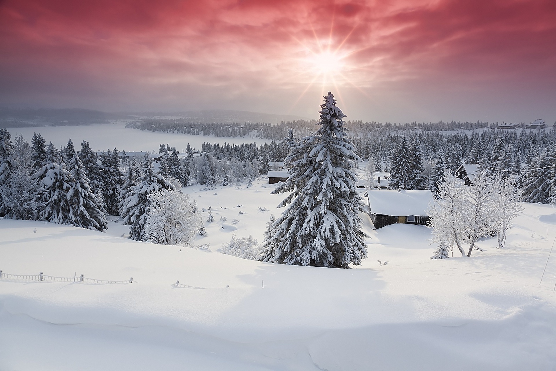 Edytor tapety: Zima, Wschód Słońca, Wieś