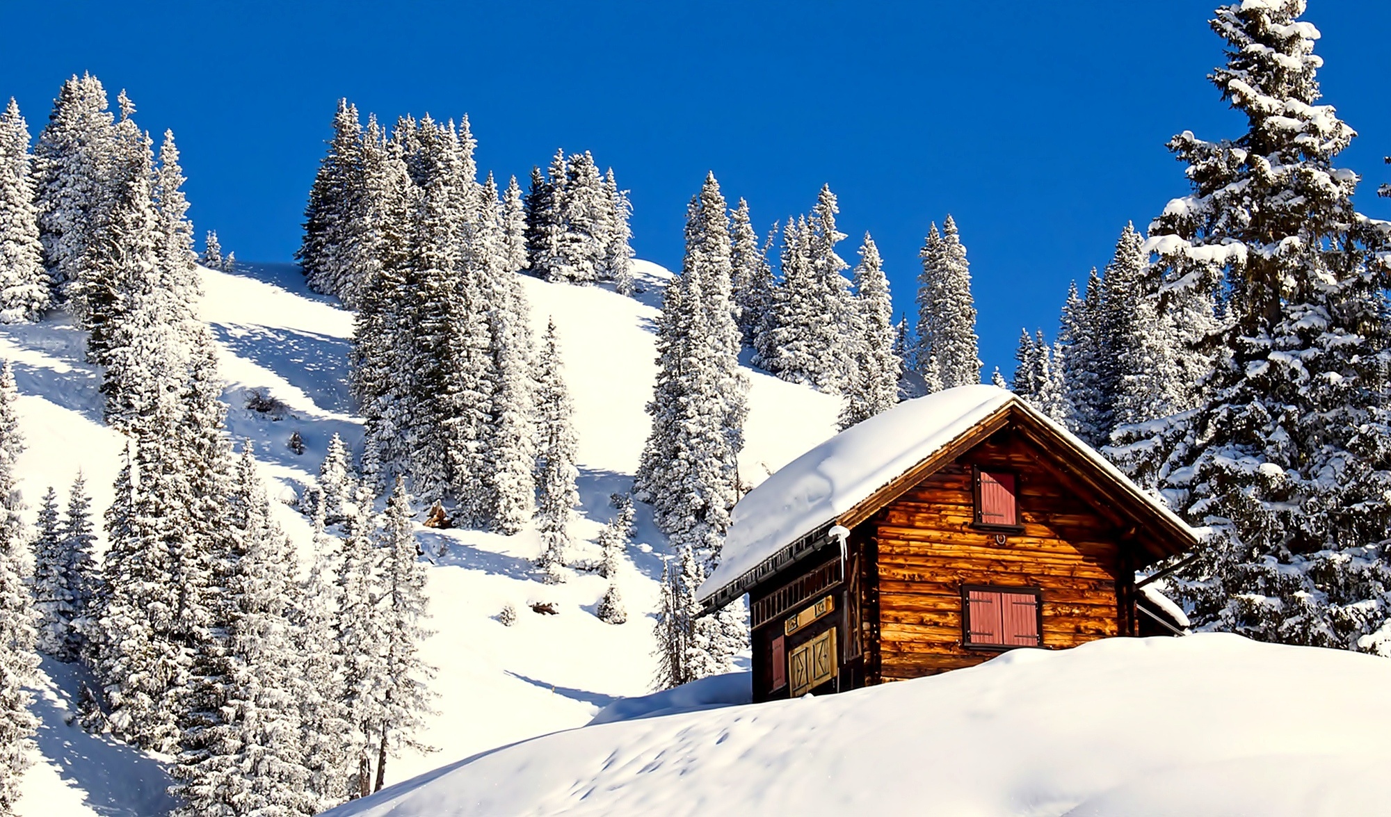 Edytor tapety: Zima, Śnieg, Domek, Drzewa, Góry