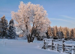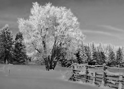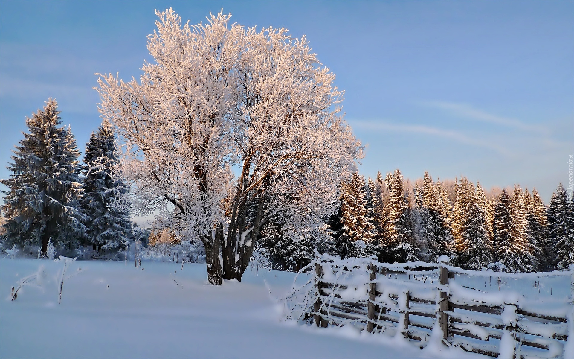 Edytor tapety: Zima, Śnieg, Las, Drzewa, Ogrodzenie