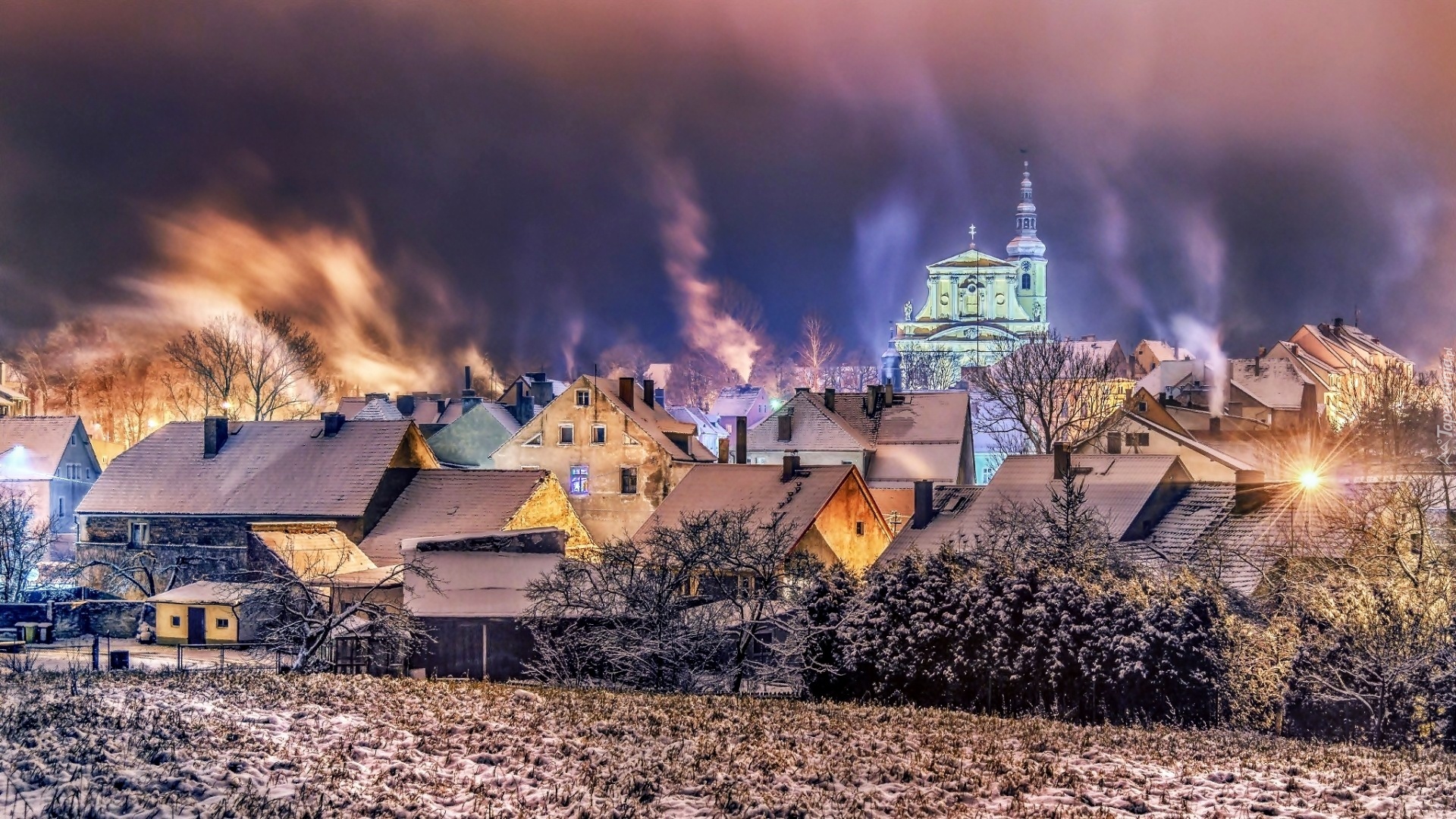 Edytor tapety: Miasto, Chmury, Domy, Kościół