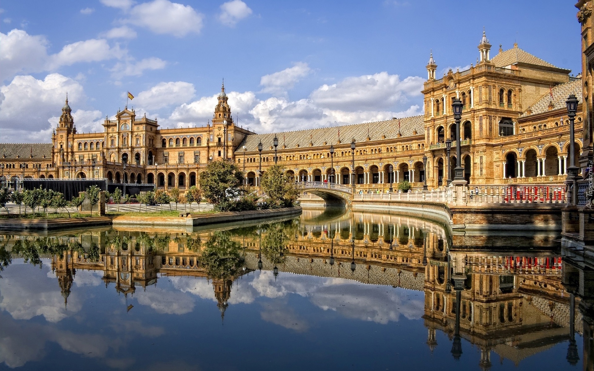 Edytor tapety: Hiszpania, Sevilla, Hotel, Plaza de Espana, Woda, Chmury