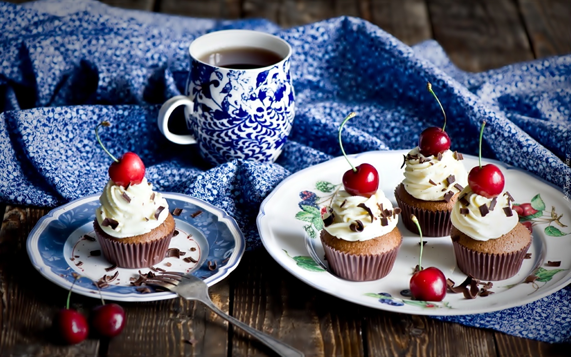 Edytor tapety: Babeczki, Wiśnie, Herbata, Talerze, Filiżanka, Widelec