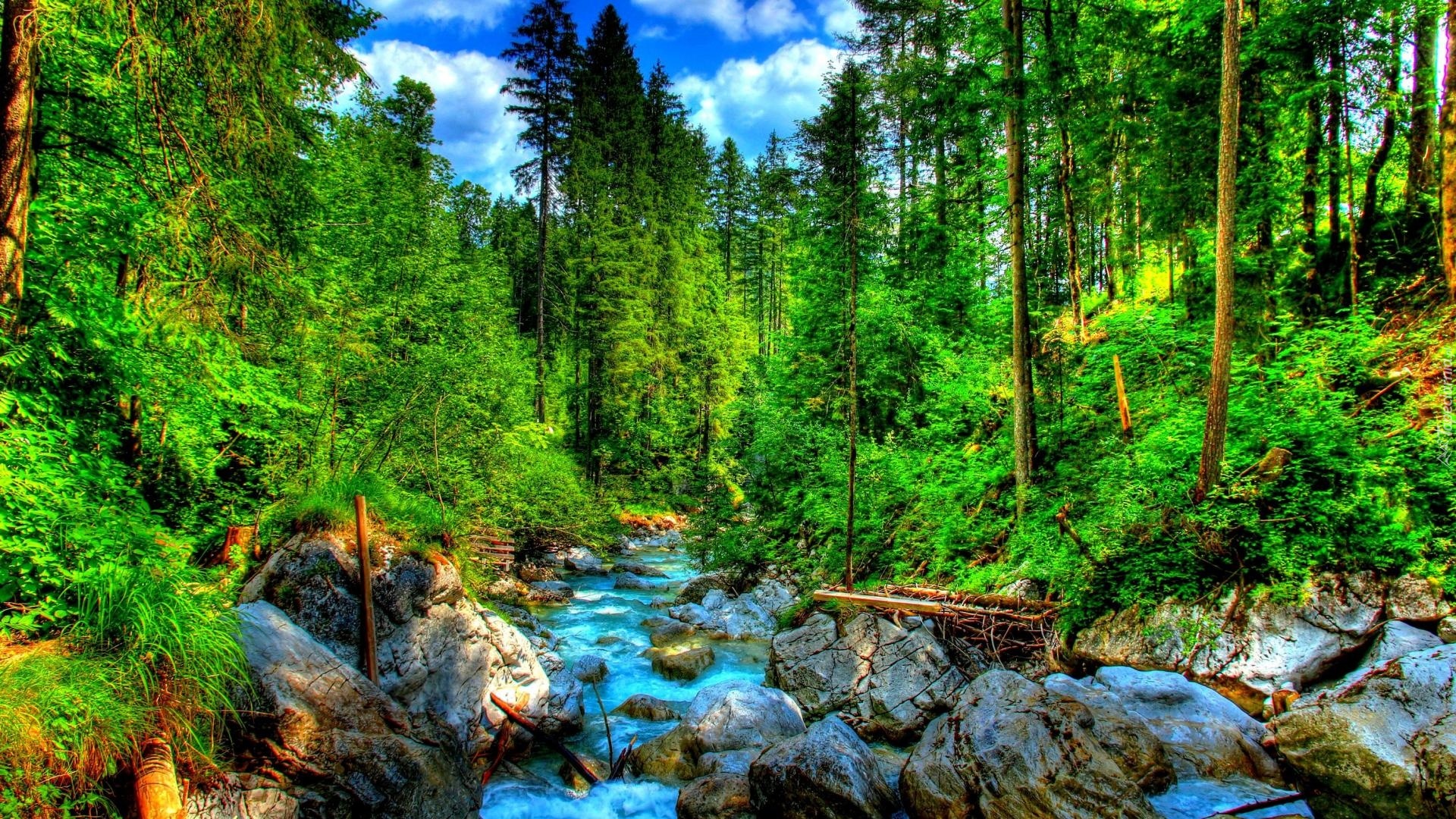 Edytor tapety: Las, Rzeka, Skały, HDR