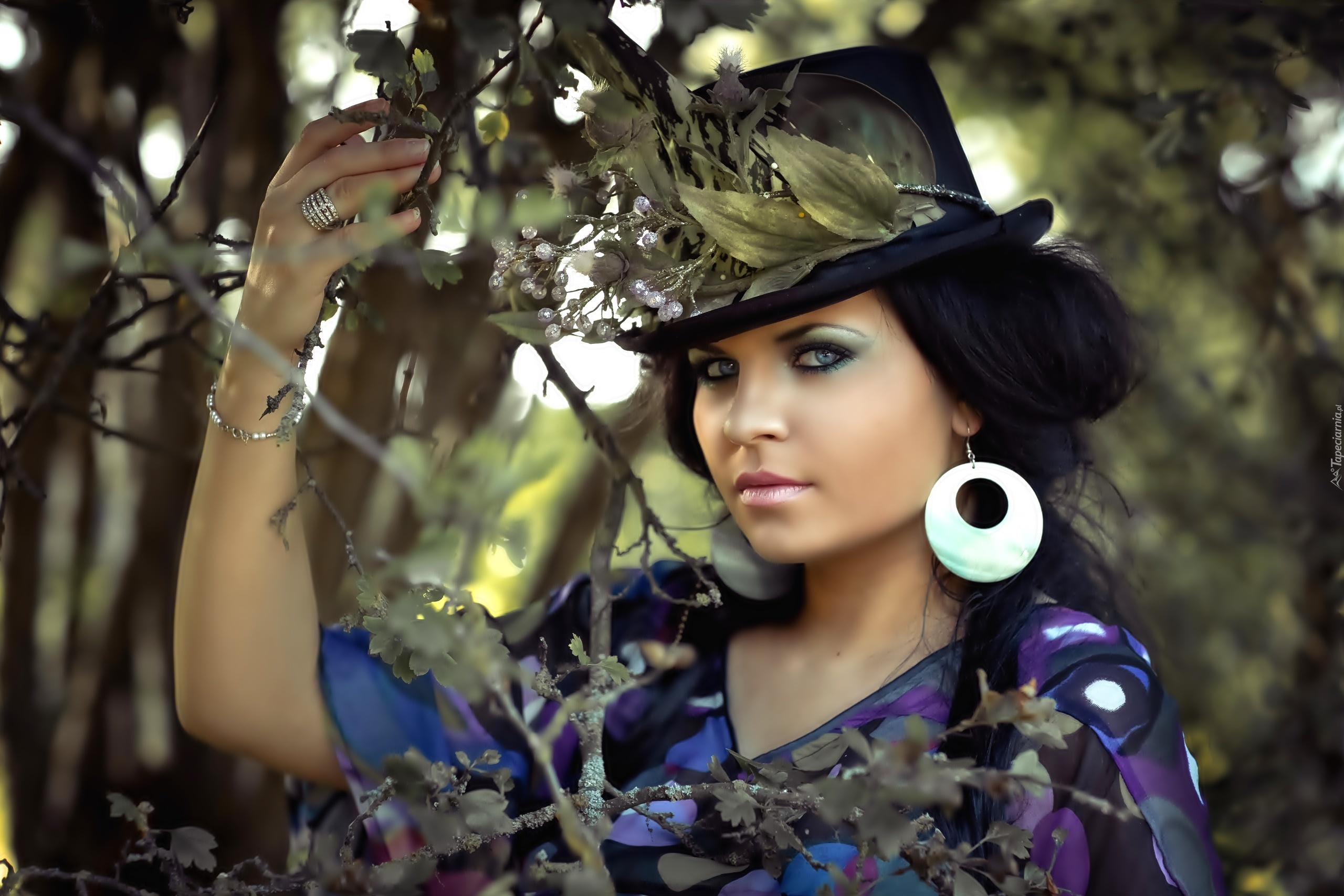 Edytor tapety: Kobieta, Biżuteria, Makijaż, Kapelusz, Drzewa