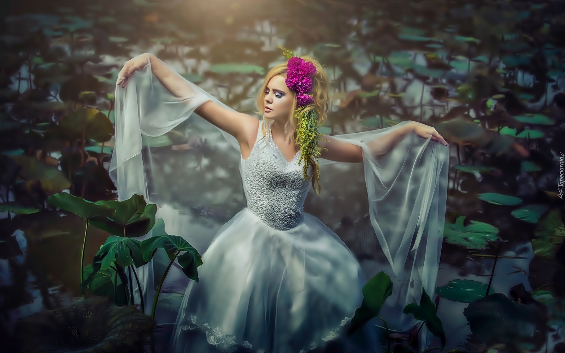 Edytor tapety: Ogród, Kobieta, Biały, Szal, Sukienka