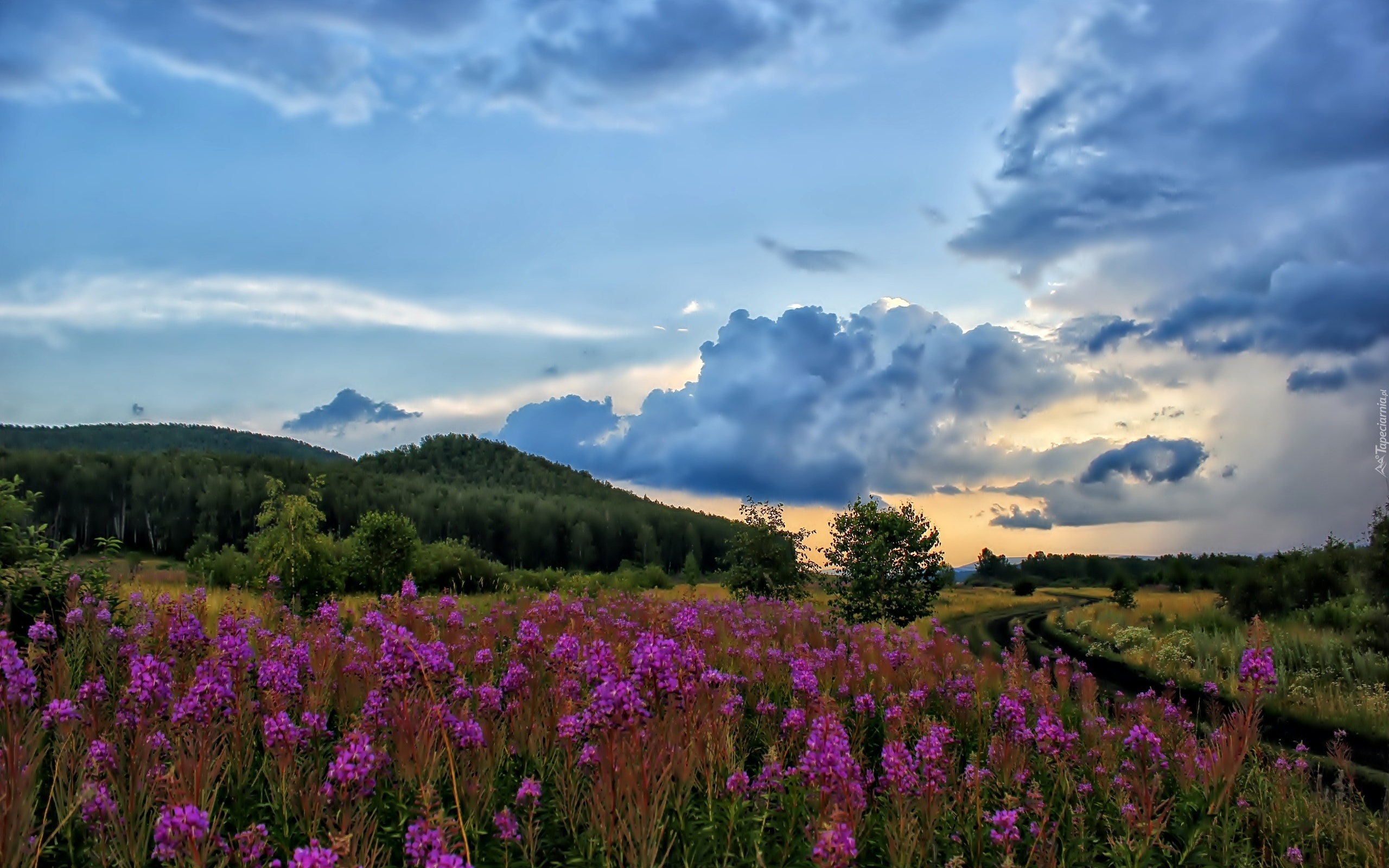 Edytor tapety: Wzgórza, Różowe, Kwiaty, Chmury, Łąka