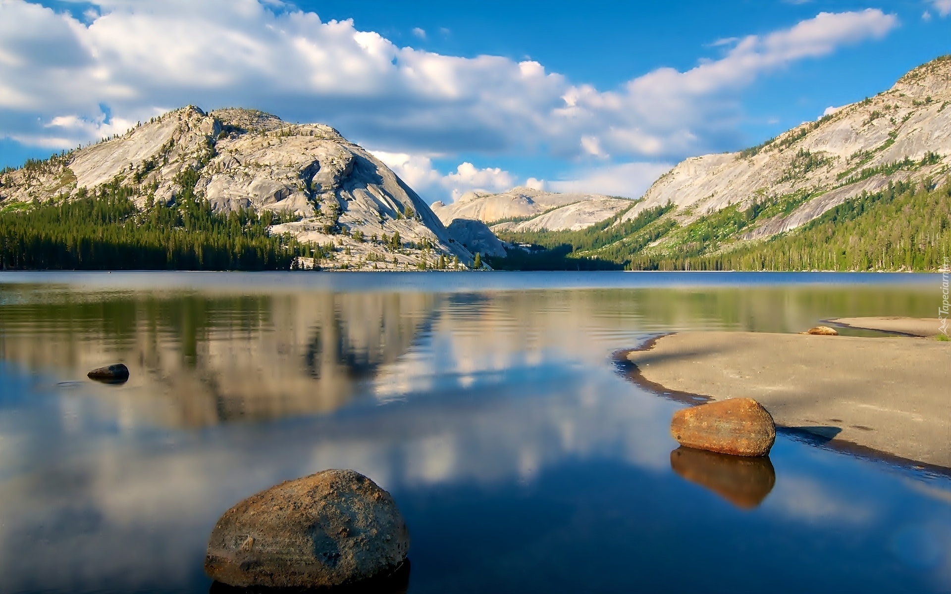 Edytor tapety: Jezioro, Góry, Kamienie, Drzewa, Obłoki, Odbicie