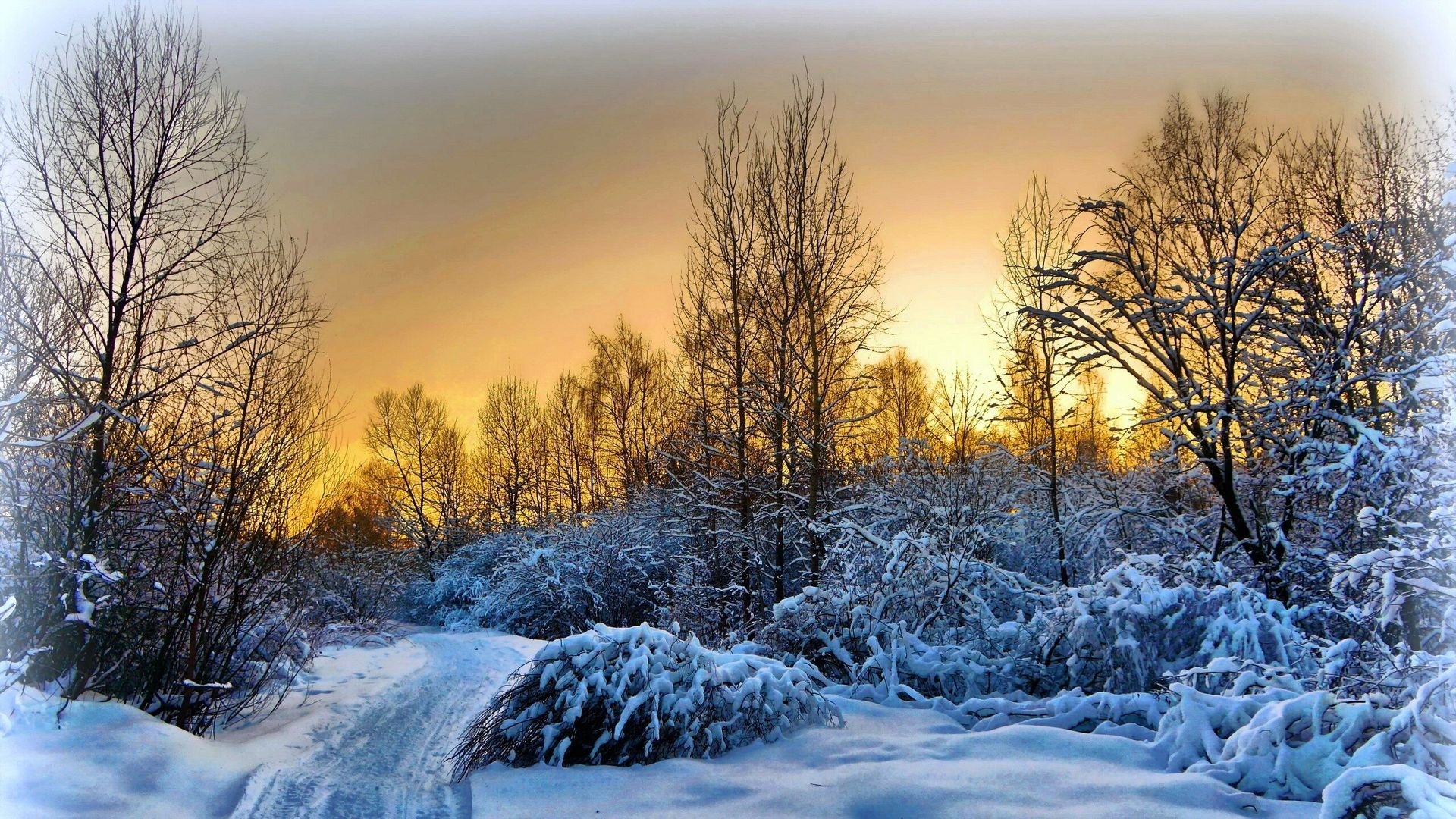 Edytor tapety: Zima, Droga, Las, Zachód Słońca
