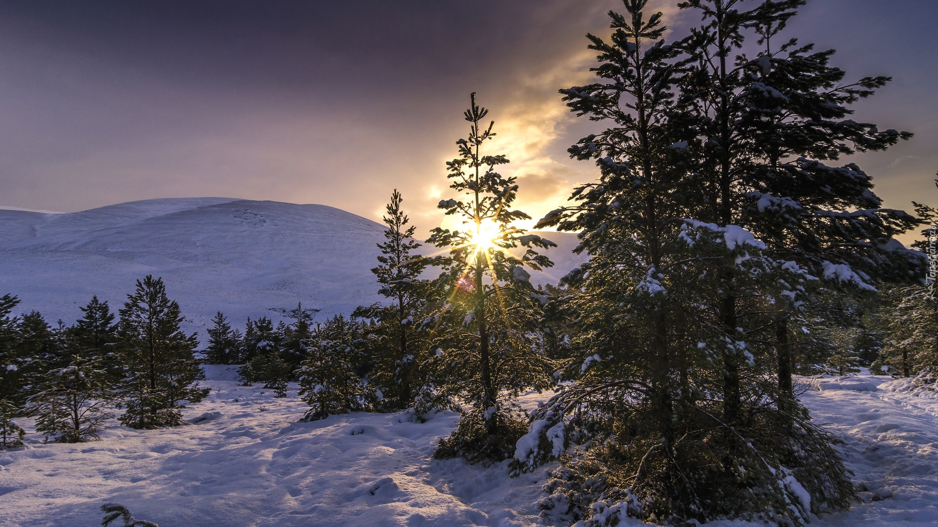 Edytor tapety: Zima, Góry, Las, Zachód Słońca