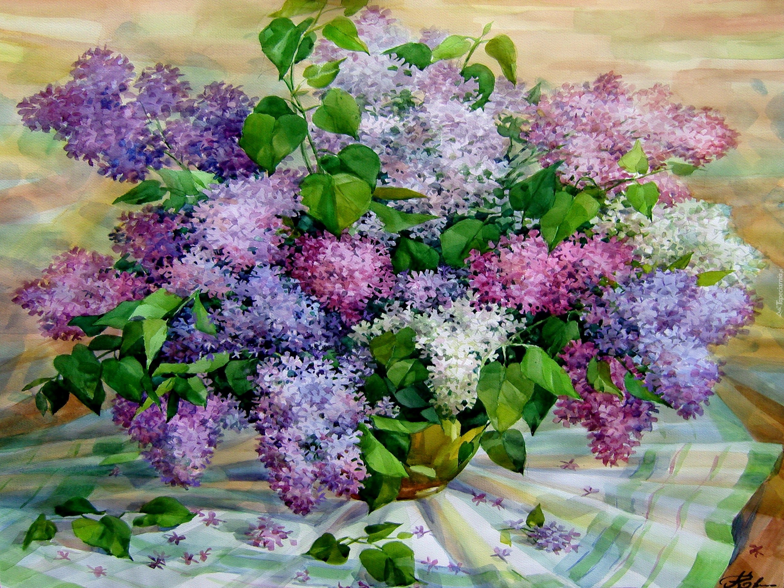 Edytor tapety: Bukiet, Bzu, Wazon, Serweta, Obraz