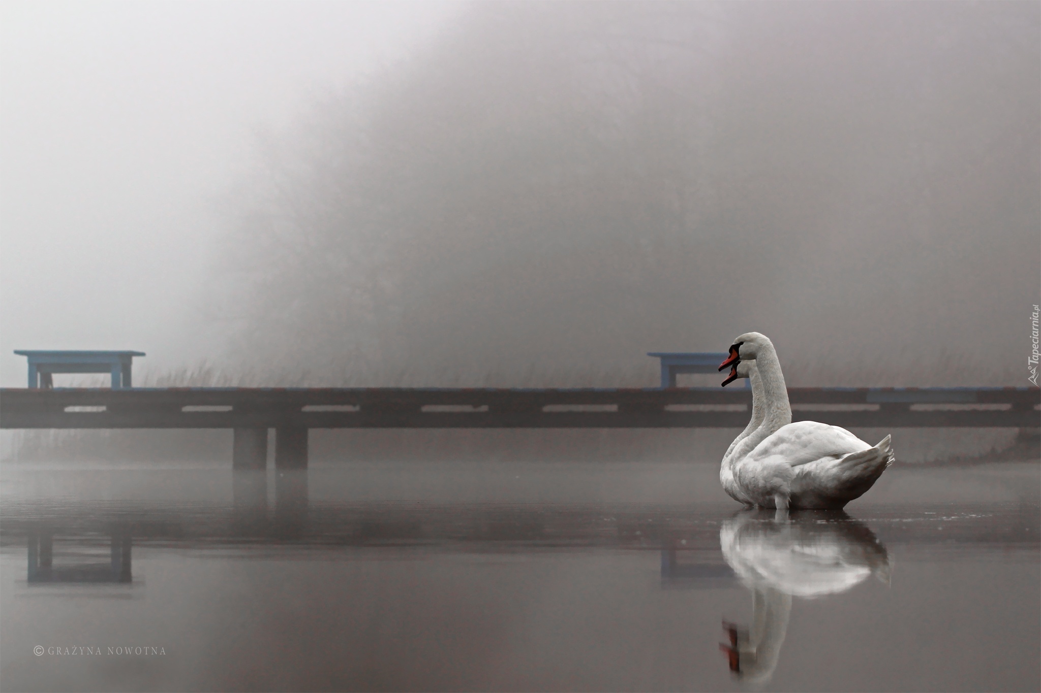 Edytor tapety: Łabędzie, Jezioro, Pomost, Mgła