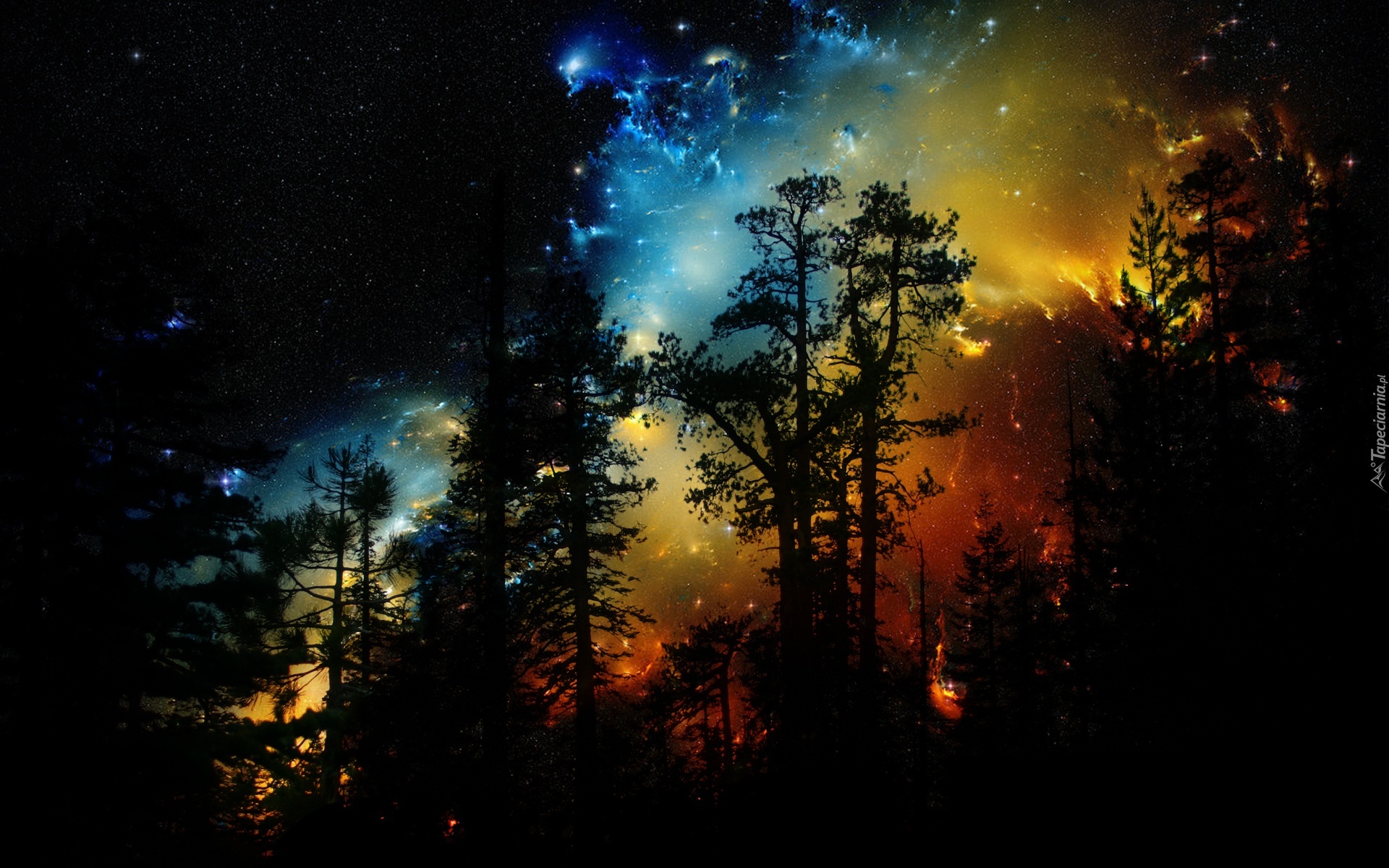 Edytor tapety: Las, Niebo, Zachód, Chmury, Gwiazdy, Fantasy