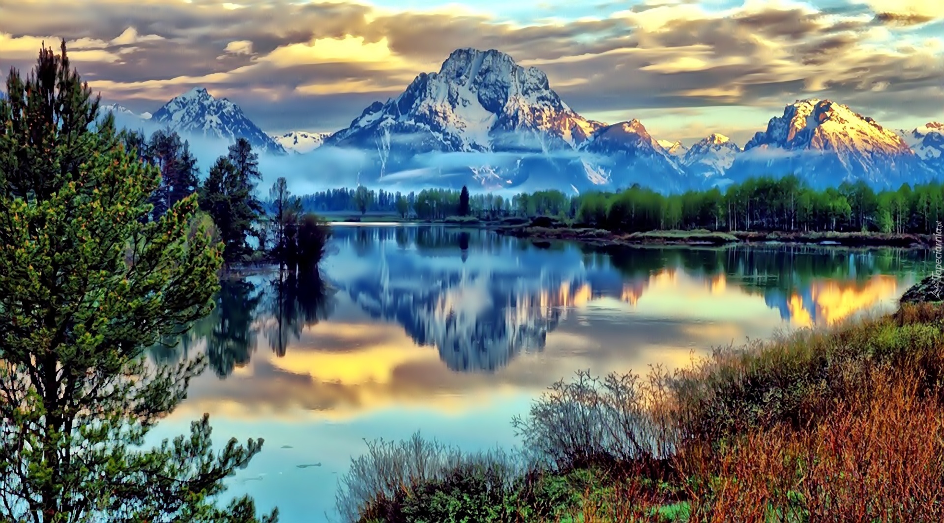 Edytor tapety: Góry, Przebijające, Światło, Rzeka, Drzewa, Odbicie