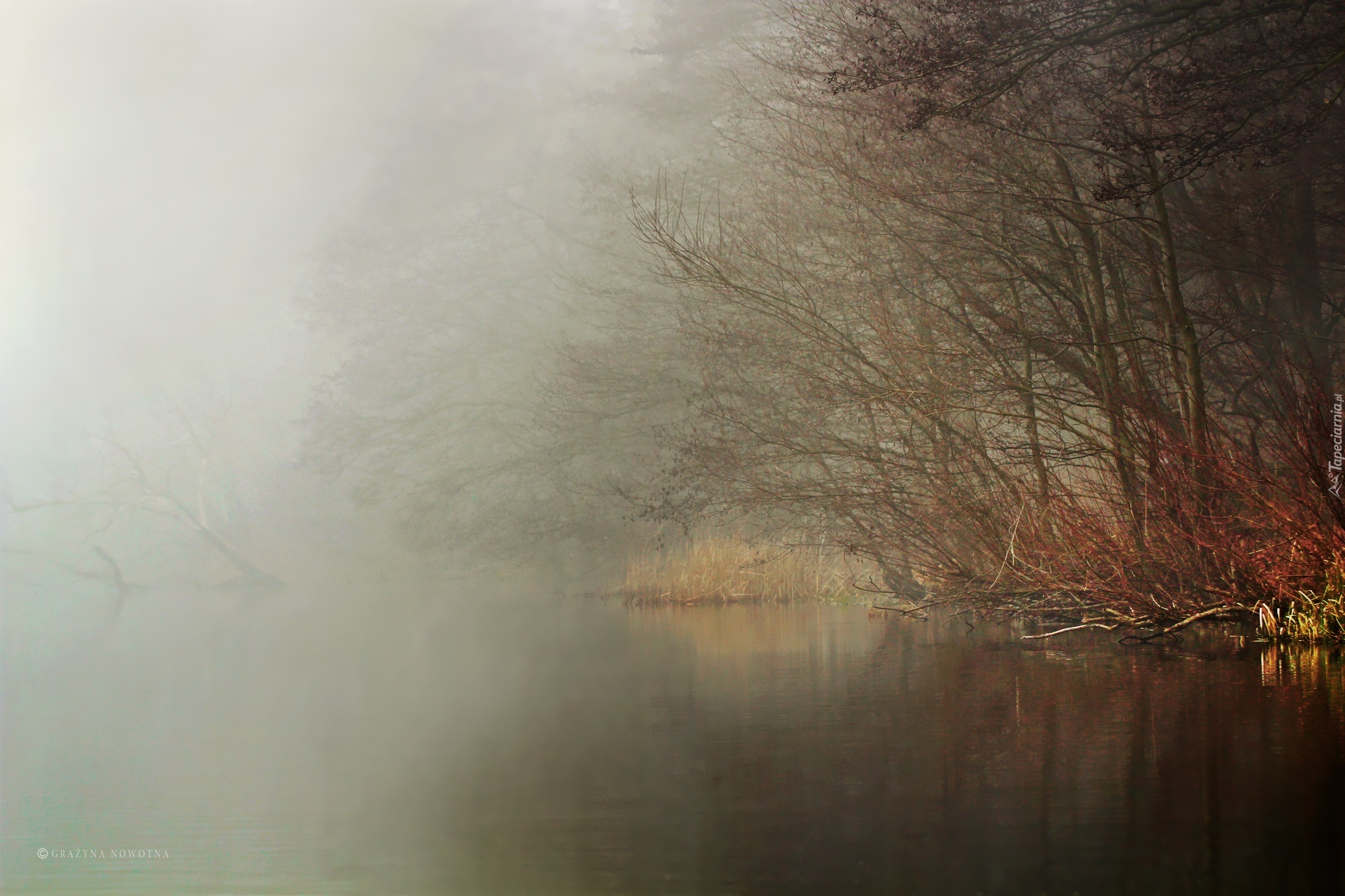 Edytor tapety: Drzewa, Trawy, Zarośla, Mgła, Jezioro