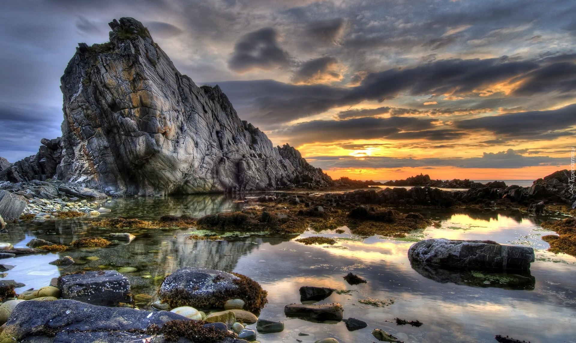 Edytor tapety: Morze, Skały, Chmury, Zachód Słońca