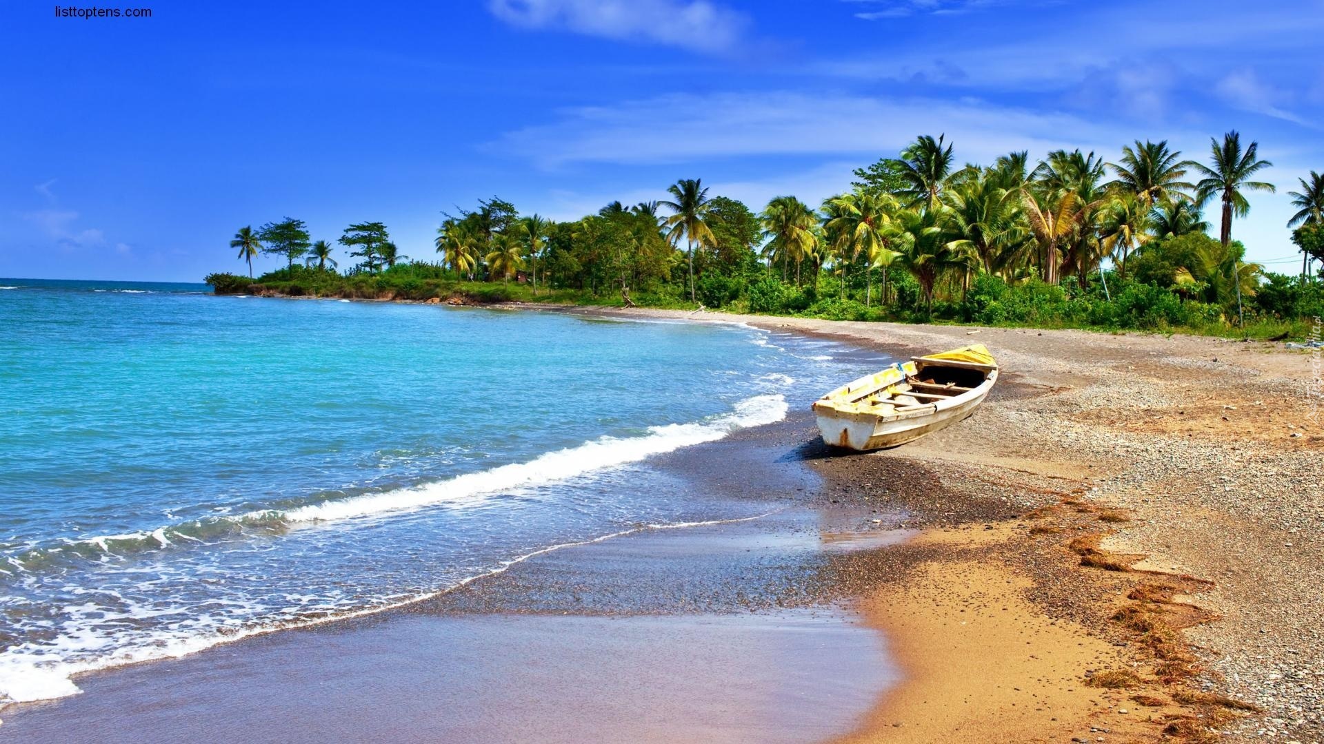 Edytor tapety: Cypel, Morze, Łódź, Palmy, Plaża