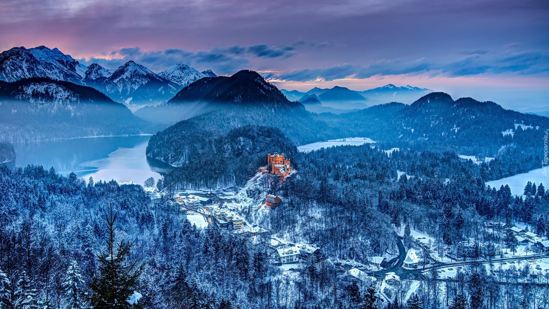 Edytor tapety: Zima, Góry, Lasy, Jeziora, Zamek
