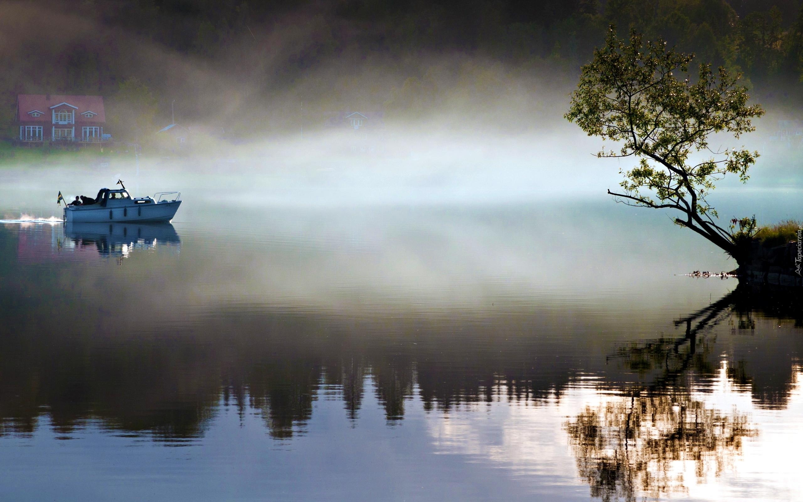 Edytor tapety: Łódka, Rzeka, Mgła, Motorówka