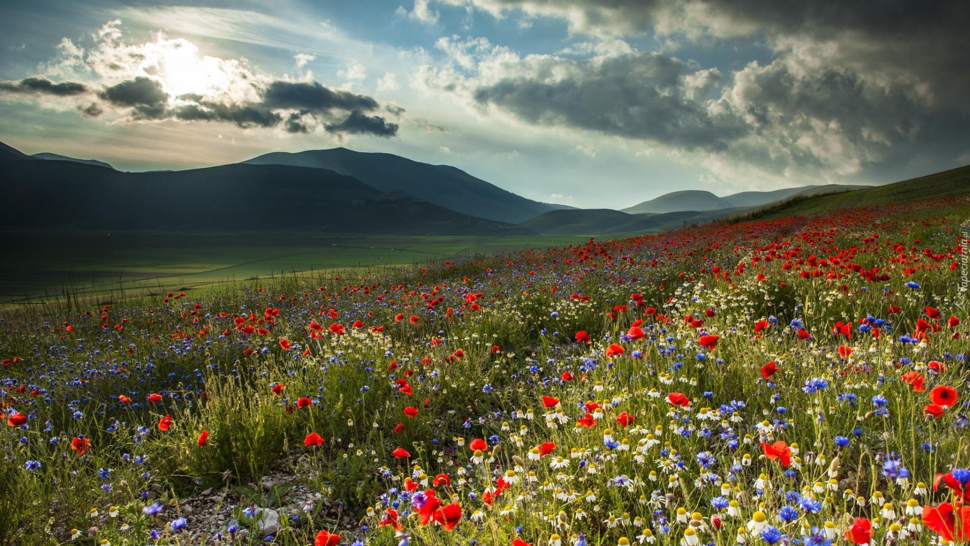Edytor tapety: Łąka, Kwiaty, Chmury, Wzgórza