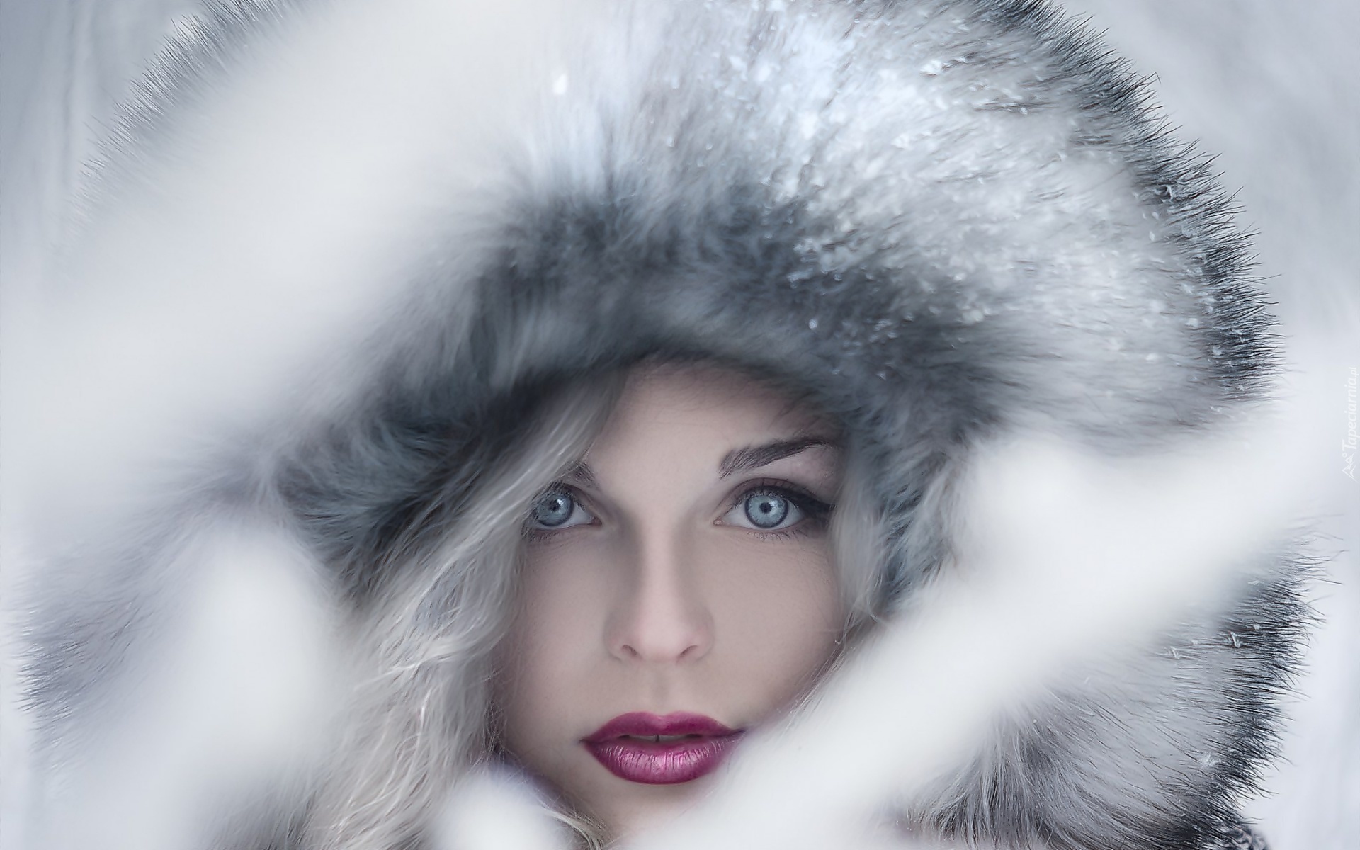 Edytor tapety: Twarz, Kobieta, Futrzana, Czapka, Kaptur, Makijaż, Zima