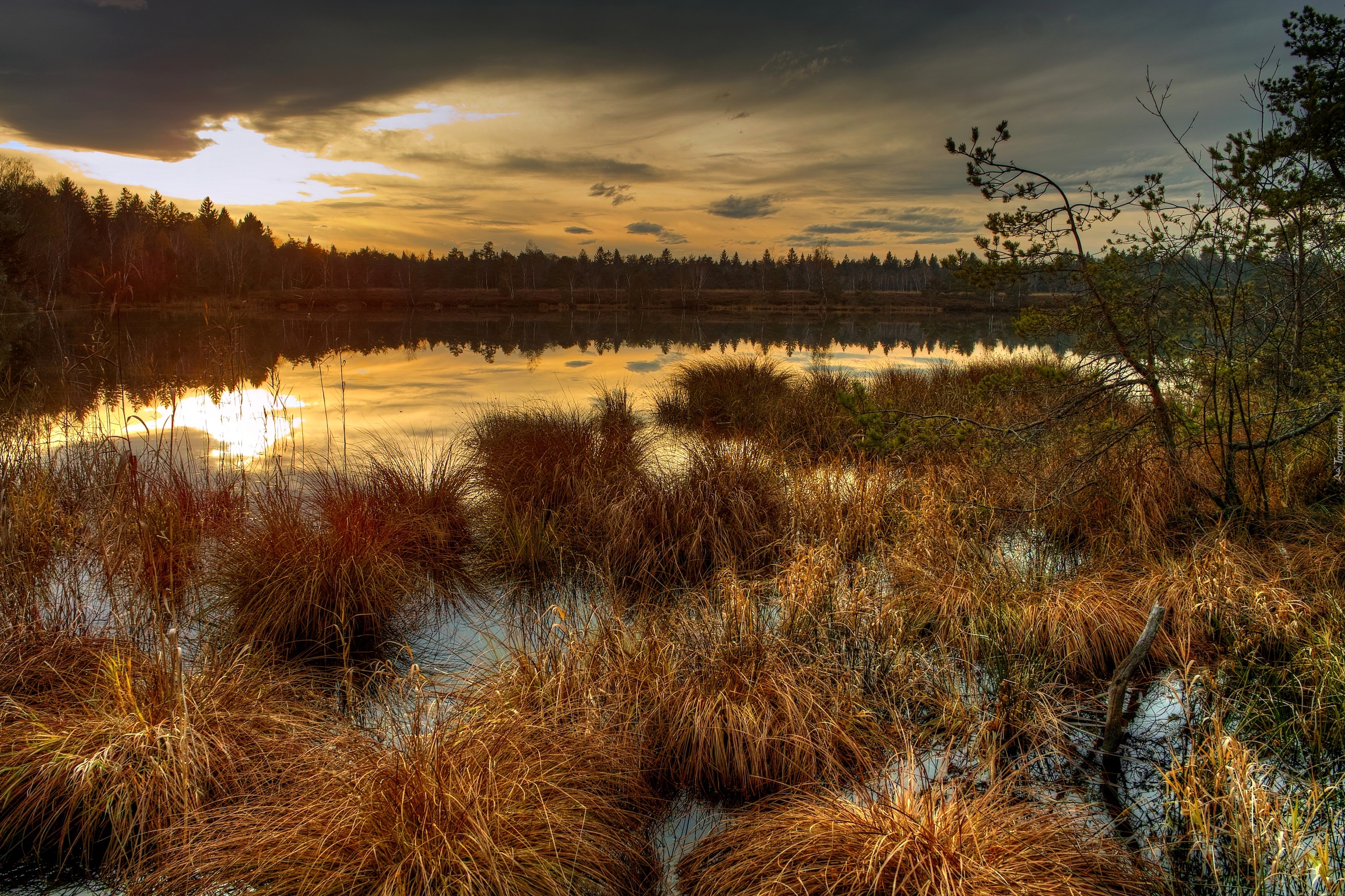 Edytor tapety: Zachód Słońca, Staw, Krzewy, Trawy