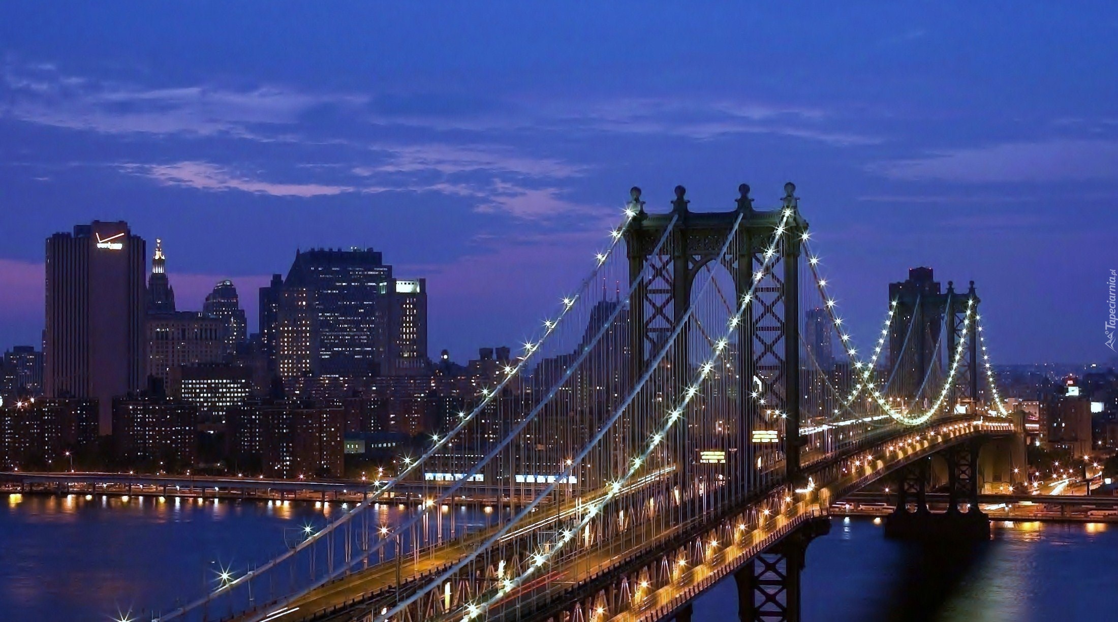Edytor tapety: Manhattan Bridge, Drapacze chmur, Oświetlenie, Miasto nocą