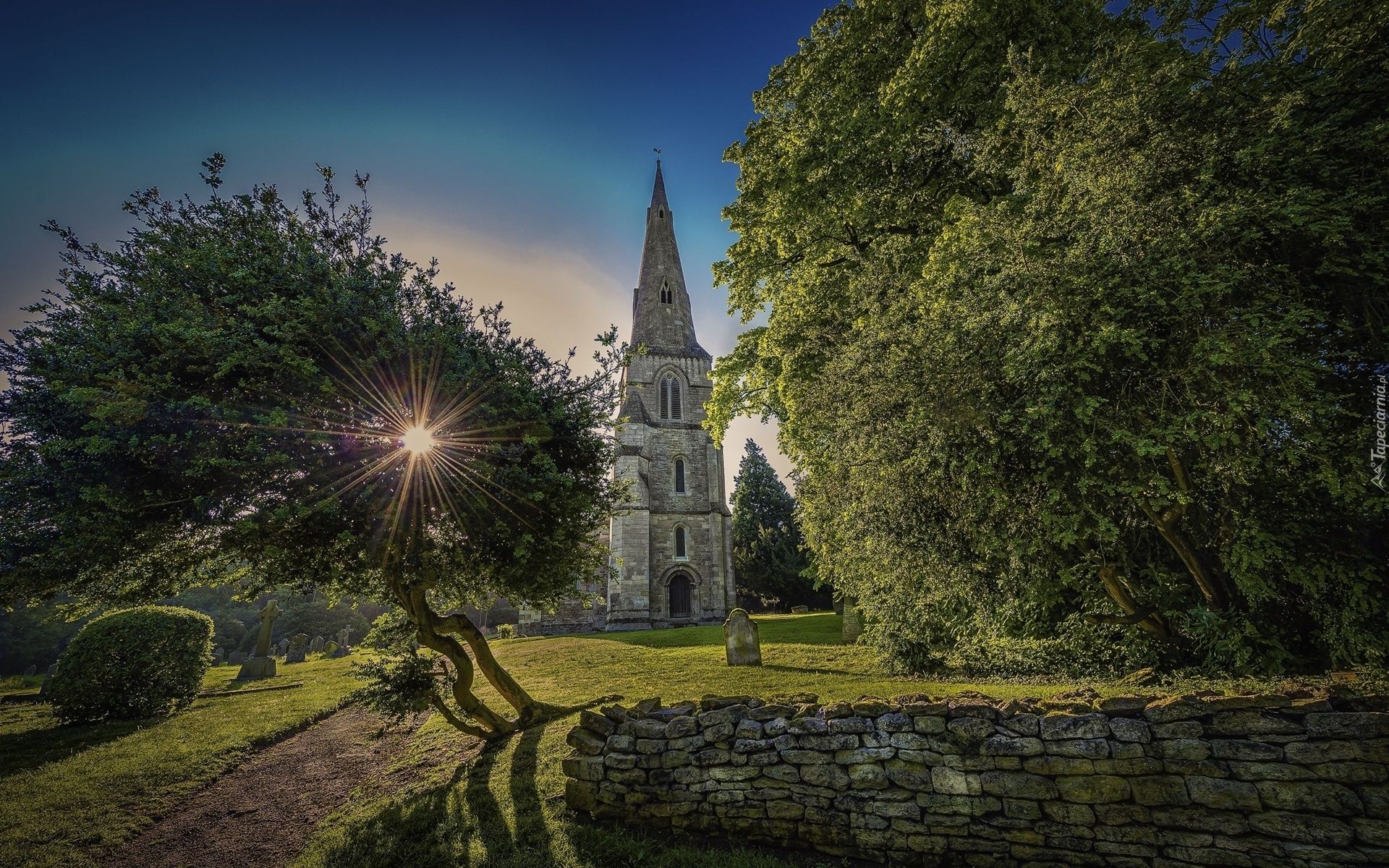 Edytor tapety: Kościół, Drzewa, Promienie, Słońca