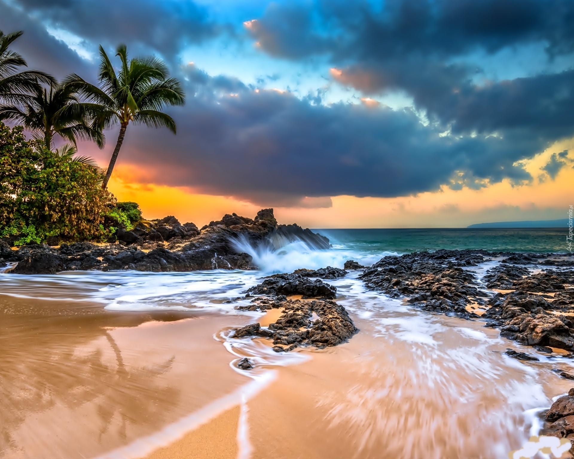 Edytor tapety: Morze, Skały, Chmury, Palmy, Zachód, Słońca