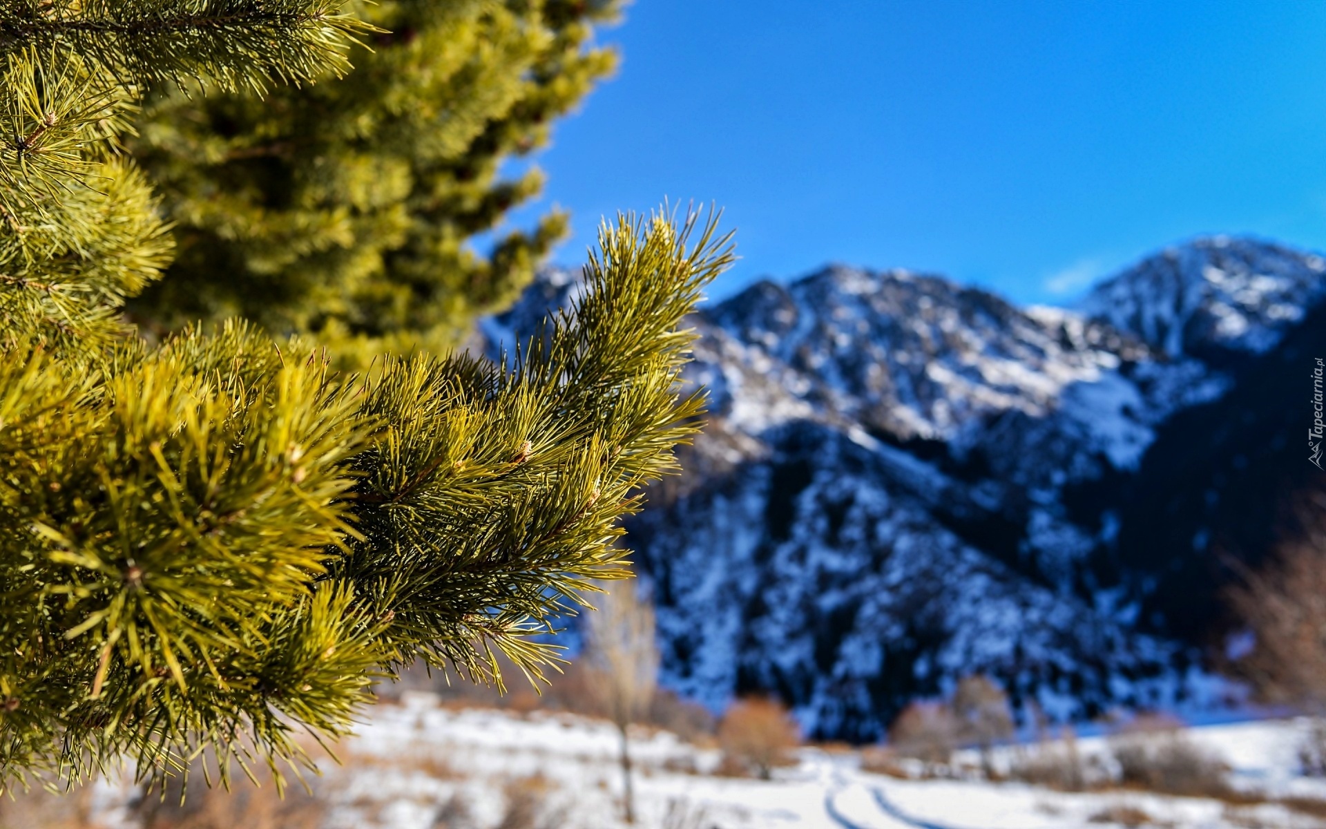 Edytor tapety: Zima, Góry, Sosna, Gałązki