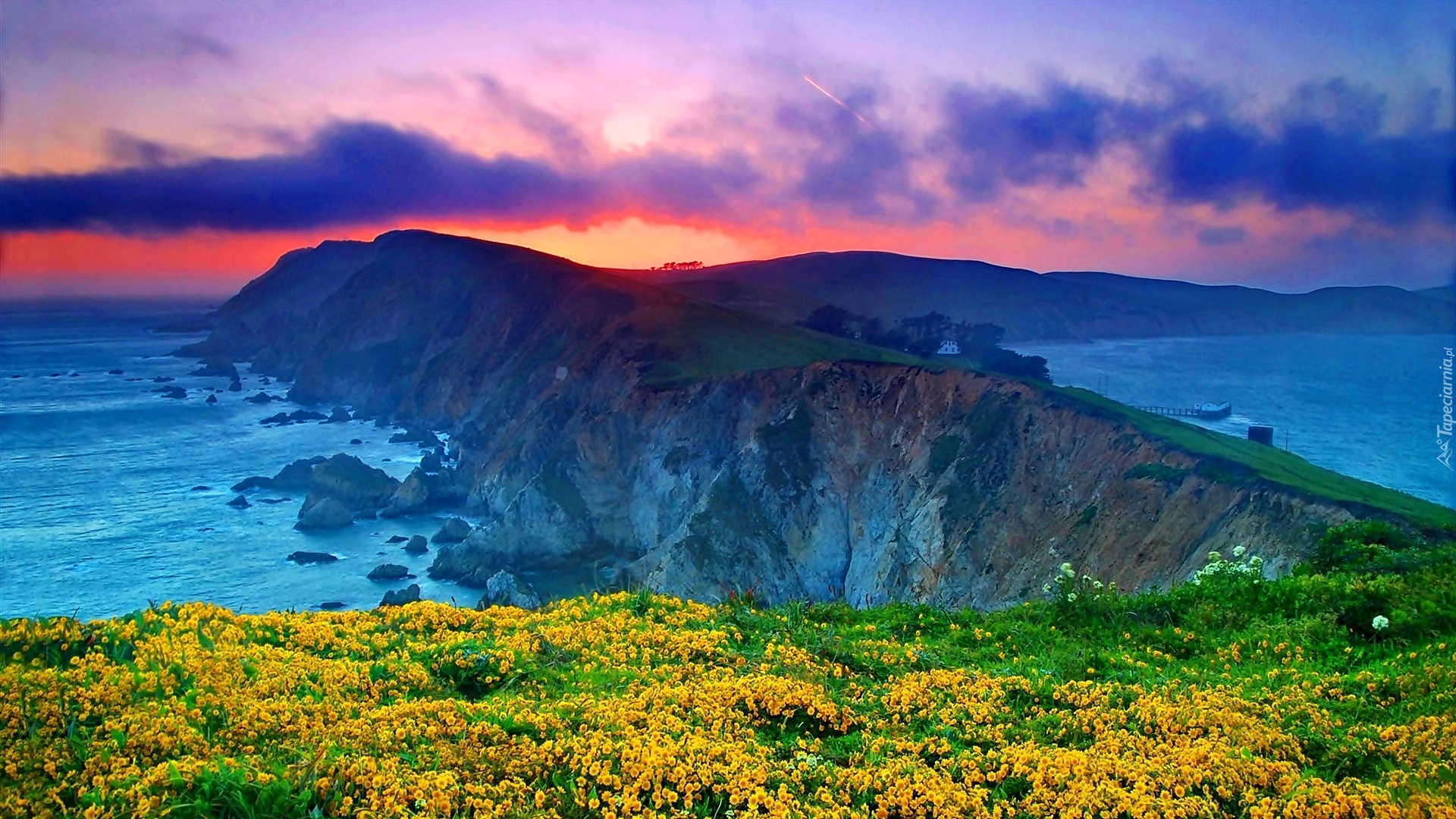 Edytor tapety: Góry, Morze, Łąka, Zachód, Słońca, Wybrzeże