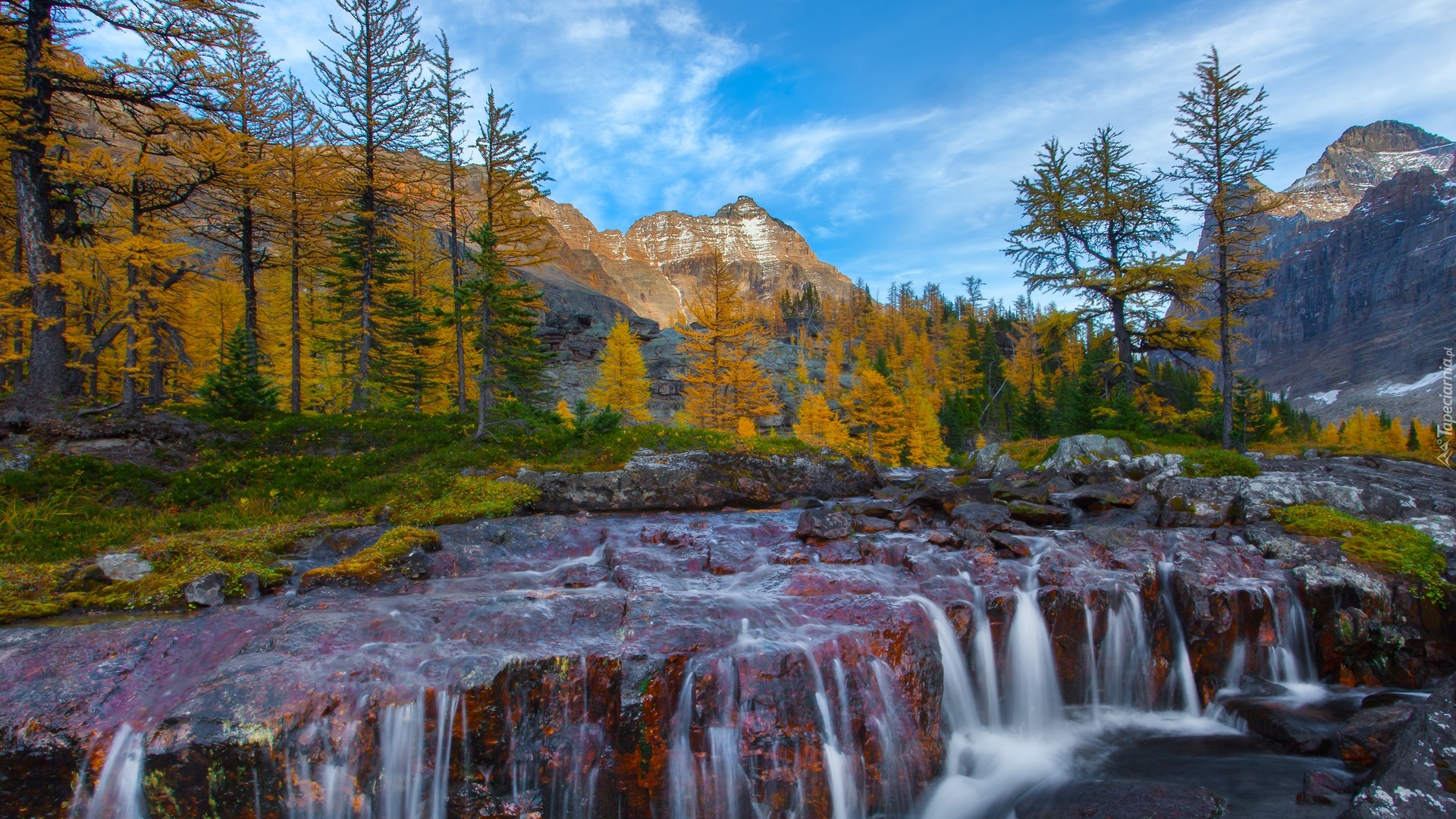 Edytor tapety: Wodospad, Rzeka, Skały, Lasy, Góry