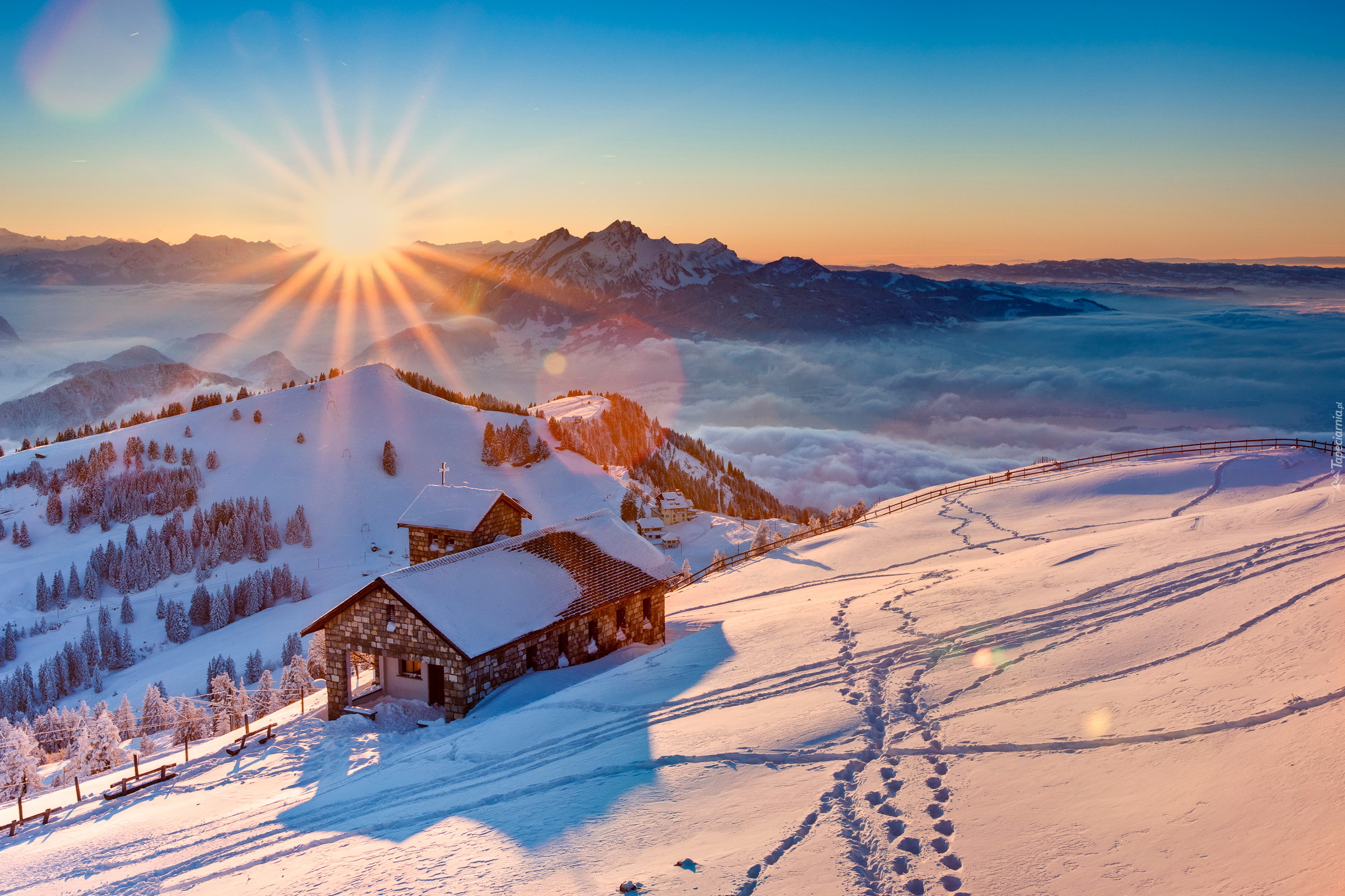 Edytor tapety: Zima, Śnieg, Promienie, Słońca, Domek, Ślady, Drzewa