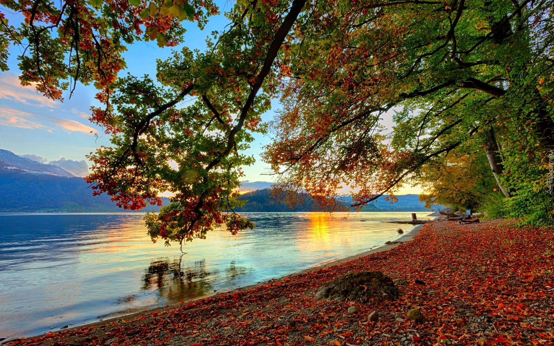 Edytor tapety: Jezioro, Wschód, Słońca, Drzewo, Jesień