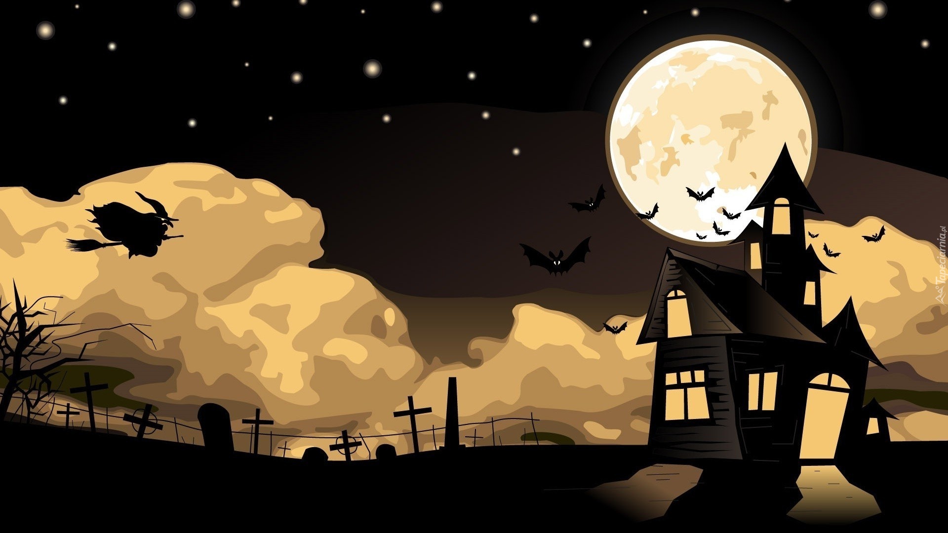 Edytor tapety: Halloween, Dom, Księżyc, Czarownica, Cmentarz, Noc