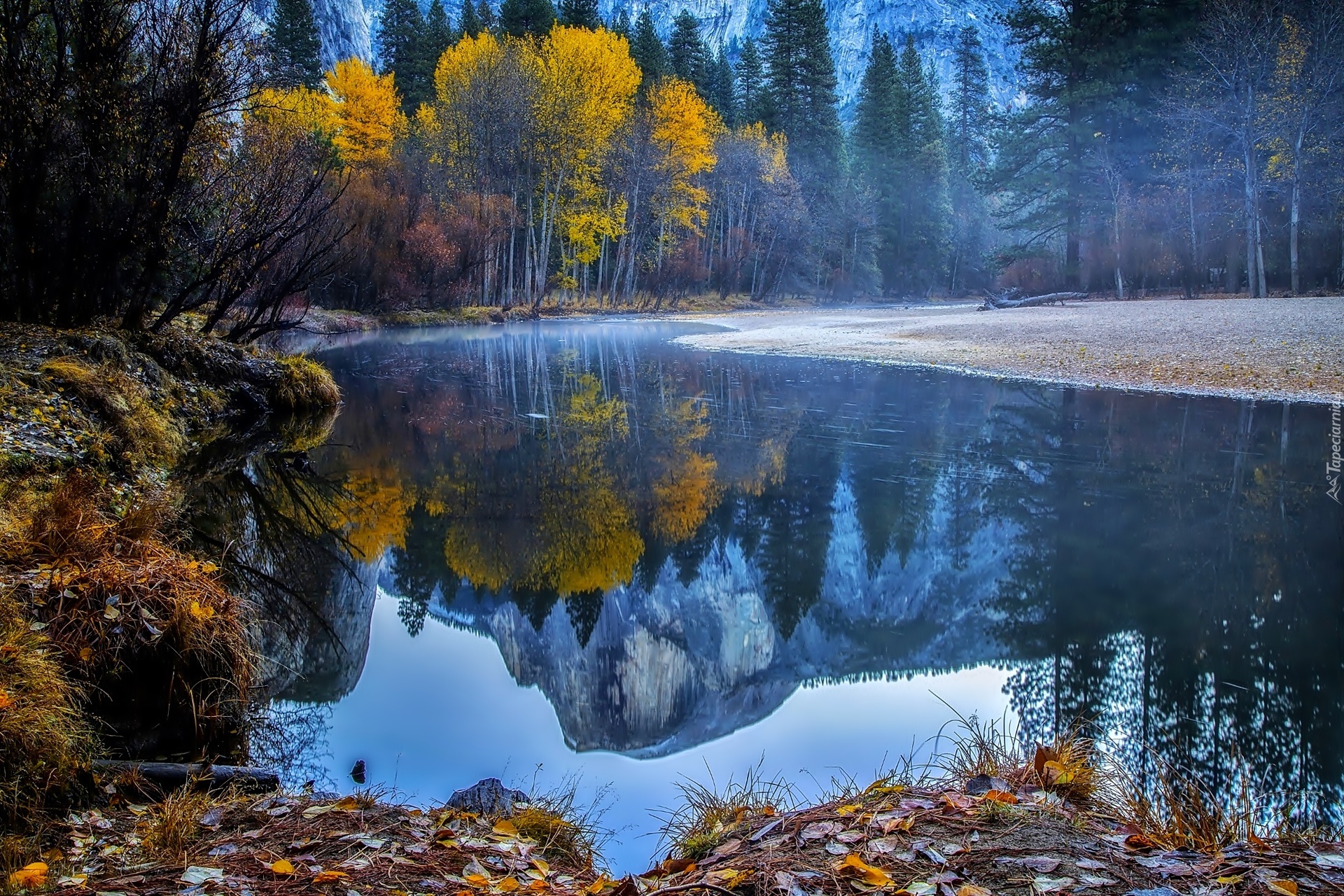 Edytor tapety: Jesień, Rzeka, Liście, Drzewa, Mgła