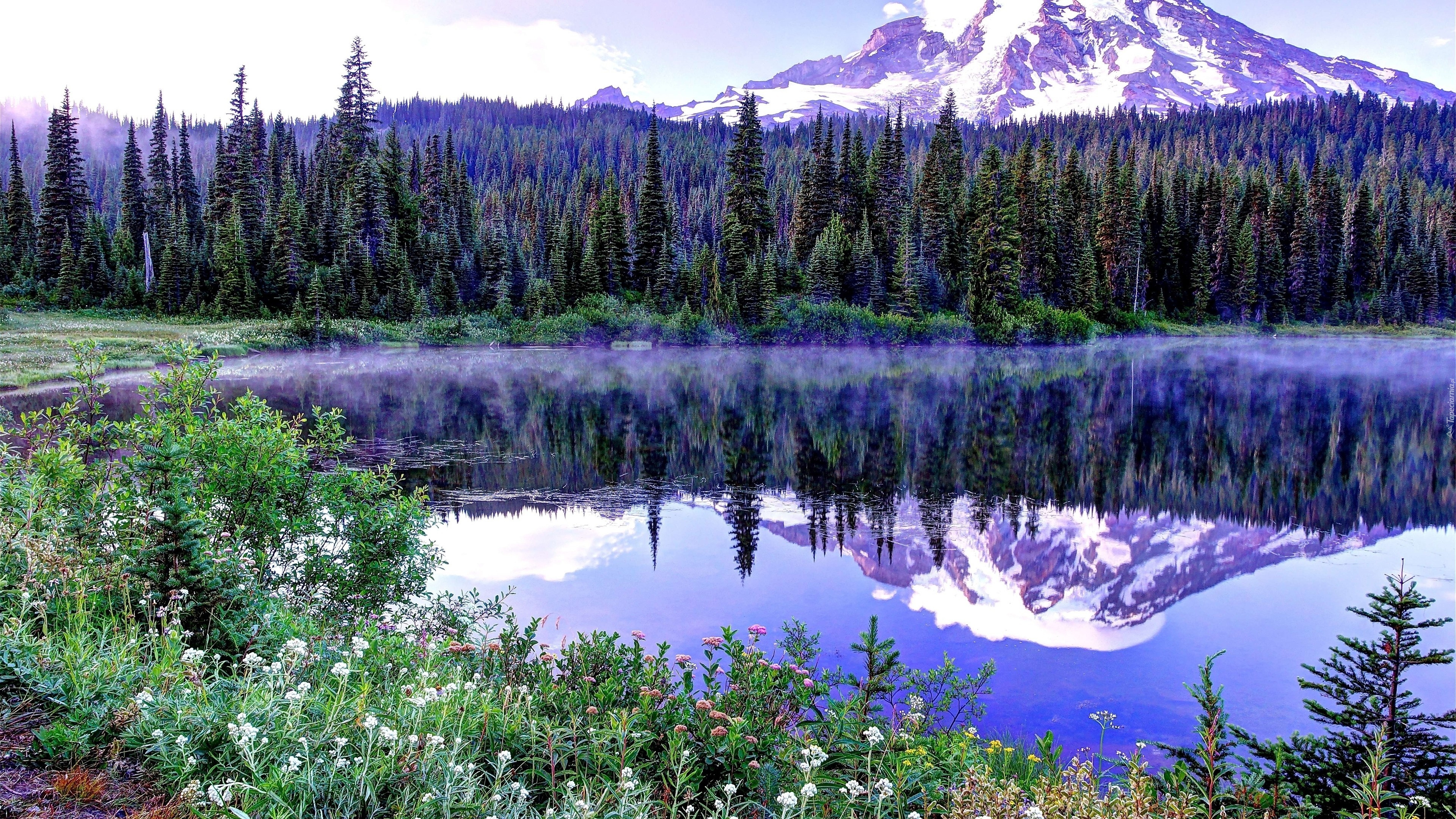 Edytor tapety: Góry, Las, Mgła, Jezioro, Kwiaty
