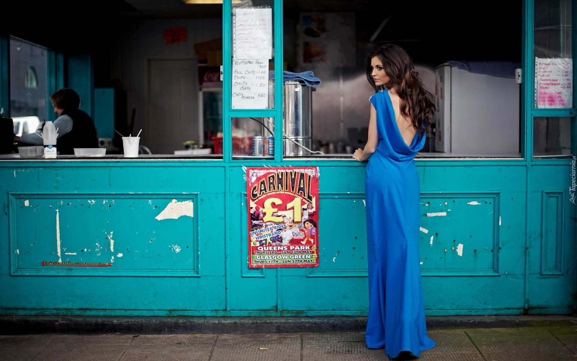 Edytor tapety: Kobieta, Modelka, Brunetka, Długa Sukienka, Bar, Ulica